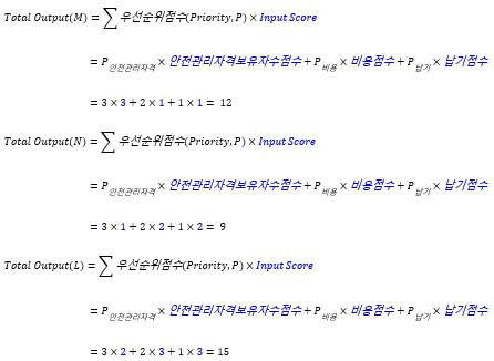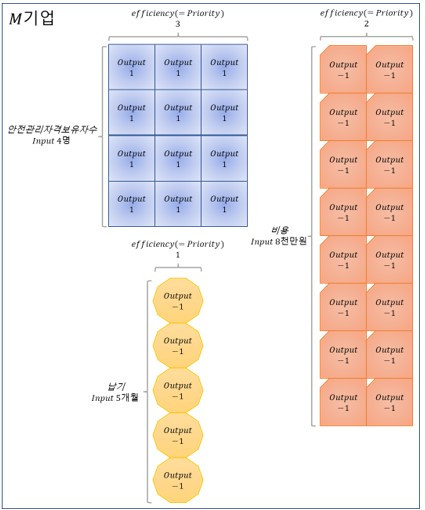 P기업 관리자 입장이 되었건, 실무자 입장이 되었건, 가장 신경이 쓰이는 기업은 M기업입니다. P기업의 최대 목적은 안전 관련 사고가 재발하지 않는 것이기 때문에, 비용이 많이 들고, 납기가 오래 걸리지만, 안전관리자격보유자수가 가장 많은 M기업을 무시할 수가 없는 것입니다. 하지만, 안전관리자격보유자수뿐 아니라, 비용과 납기 인풋 모두 고려한 선택을 해야 하는 상황임을 잊으면 안 됩니다. 모든 인풋을 고려하지 못한 채 결정을 내린다면 다음과 같이 결정을 내릴 수도 있는 것이죠.