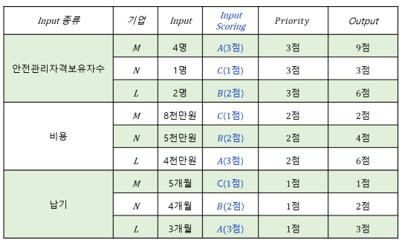 안전관리자격보유자수, 비용, 납기 세 가지 인풋 종류에 대해 우선순위점수 부여는 이미 완료했습니다. 인풋의 단위와 특성이 다른 상황이므로, 세 업체의 인풋에 대해 점수 매기기를 진행해 보자. 가장 좋은 조건을 가진 업체에게 A(3점)를 부여하고, 가장 나쁜 조건을 가진 업체에게 C(1점)를 부여해 봅시다. 그리고, 중간 조건을 가진 업체에게는 B(2점)를 부여해 봅시다.