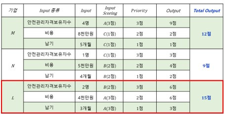 이 과정을 통해, 업체 선정 담당자로서 L기업을 솔루션 제공 업체로 결정할 수 있다는 것을 알 수 있습니다. 그 이유는 L기업의 아웃풋이 15점으로, M기업 대비 3점 높고, L기업 대비 6점 높기 때문입니다. 각 기업을 기준으로 표를 구성해 보면 아래와 같습니다.