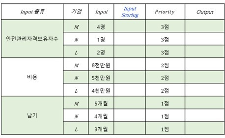 현재 각 기업 별 아웃풋을 산출이 어려운 이유는 각 인풋의 단위가 다르고 특성이 다르기 때문이라고 했습니다. 따라서, 아래와 같이 인풋 Scoring을 추가하여 표를 구성해 보았습니다.