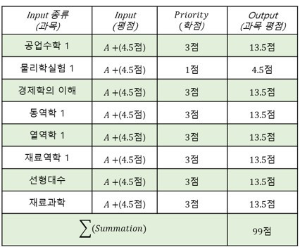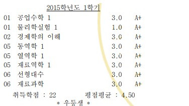 2015학년도 1학기에 저는 총 8개 과목을 수강하였습니다. 총 8개 과목에 대한 평가는 "평점"이라는 Scoring으로 구성되어 있음을 알 수 있습니다. A+=4.5점/A0=4.0점/B+=3.5점/B0=3.0점/C+=2.5점/C0=2.0점/D+=1.5점/D0=1.0점/F=0점을 의미하죠. 성적표 양식을 우리가 익숙한 양식으로 변경해 보면 아래와 같습니다.