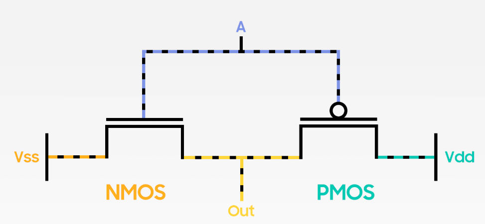 두 개의 트랜지스터를 이어 놓은 인버터 회로도 출처 : 삼성전자 DS부문 공식 홈페이지
