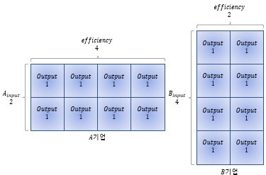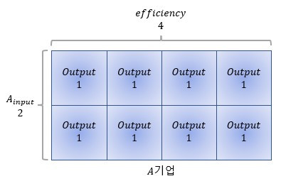 예를 들어, A기업의 인풋, Ainput 1개의 효율이 4라는 것을 알고 있을 때, Ainput 2개가 창출할 수 있는 아웃풋은 8이라는 것을 쉽게 계산할 수 있습니다.