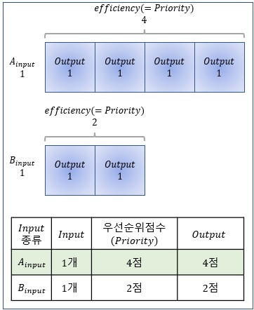 우리가 아는 정보는 Ainput의 효율은 4이고, Binput의 효율은 2라는 점입니다. 그런데 갑자기 우선순위점수라니, 조금 당황스럽긴 합니다. 하지만, 우리가 Ainput를 Binput보다 우선순위에 두고 선택할 수 있었던 기준은 효율이라는 점을 쉽게 알 수 있습니다. 따라서, 우리가 각 인풋에 우선순위점수를 부여해야 한다면, 각 효율과 동일한 점수를 부여하면 되겠습니다. 즉, Ainput에게 4점을 부여하고, Binput에게 2점을 부여할 수 있는 것입니다. 결국, 우리는 Ainput가 Binput보다 2점 높다고 답변할 수 있는 것이죠.