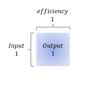 따라서, 효율이 크다는 표현은 동일한 아웃풋을 만들어 내는 것에 필요한 인풋이 적게 필요하다는 말입니다. 효율의 의미를 직관적으로 이해할 수 있도록 사각형의 넓이로 설명을 해볼까요? 가로의 길이는 효율, 그리고 세로의 길이는 인풋을 의미할 때, 가로 및 세로의 길이가 각각 1인 정사각형의 넓이는 1입니다. 즉, 아웃풋의 크기를 1이라고 말할 수 있습니다.