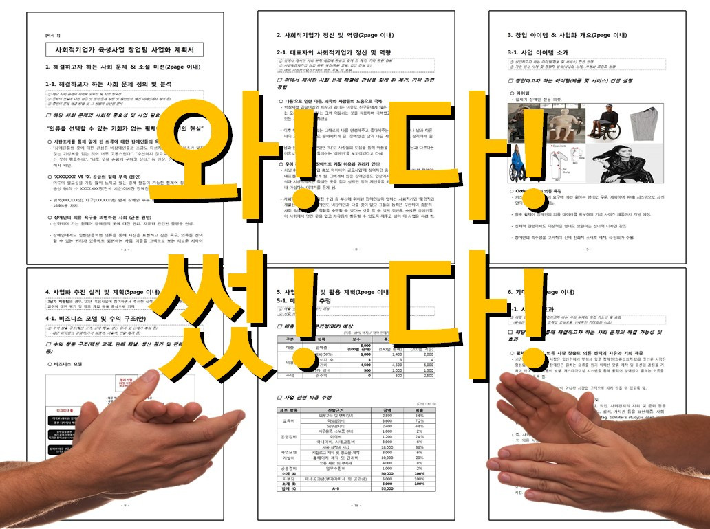 "보시면 깜짝 놀랄 텐데요~ 쓰셔야 할 것들이 많습니다. 가장 중요한 것이 사업계획서인데요. 이것을 쓰는 것은 쉽지 않습니다. 내용이 좀 많거든요. 그래도 우리는 열심히, 잘 써야 합니다. 아까 말씀드렸듯이 서류 심사는 사회적기업가 육성사업에 합격할 수 있는 1차 관문이기 때문이지요. 합격을 위해 몇 가지 팁을 알려드리자면... 개조식, 두괄식으로 작성하셔야 하고요. 강조하려는 문장은 굵기와 크기를 조절하시고요, 밑줄을 그어주시는 것도 좋습니다. 도표, 이미지를 활용하시는 것도 중요합니다. 왜냐하면... 심사하시는 분들은 짧은 시간 내에 많은 서류들을 봐야 하기 때문에 서류가 눈에 확 들어와야 하거든요. 그렇죠, 총괄책임자님?"