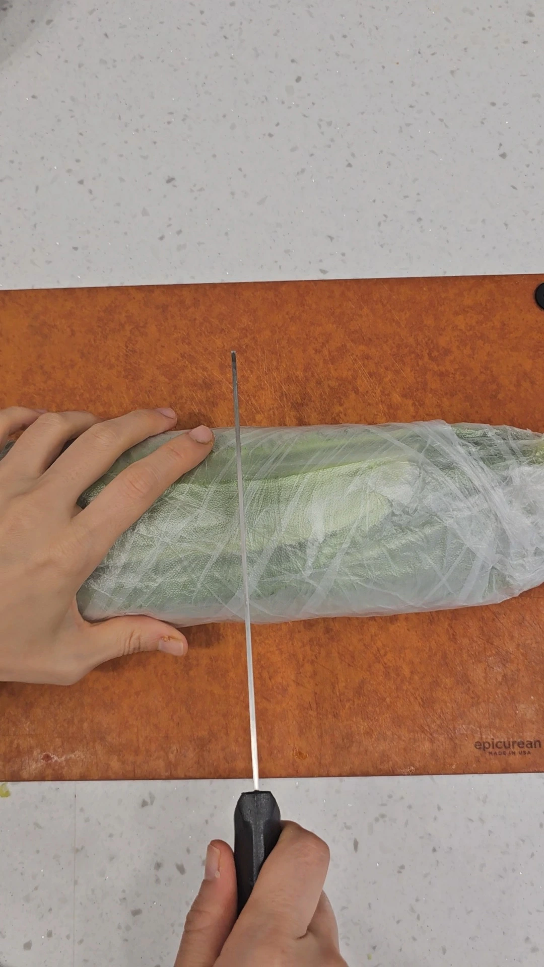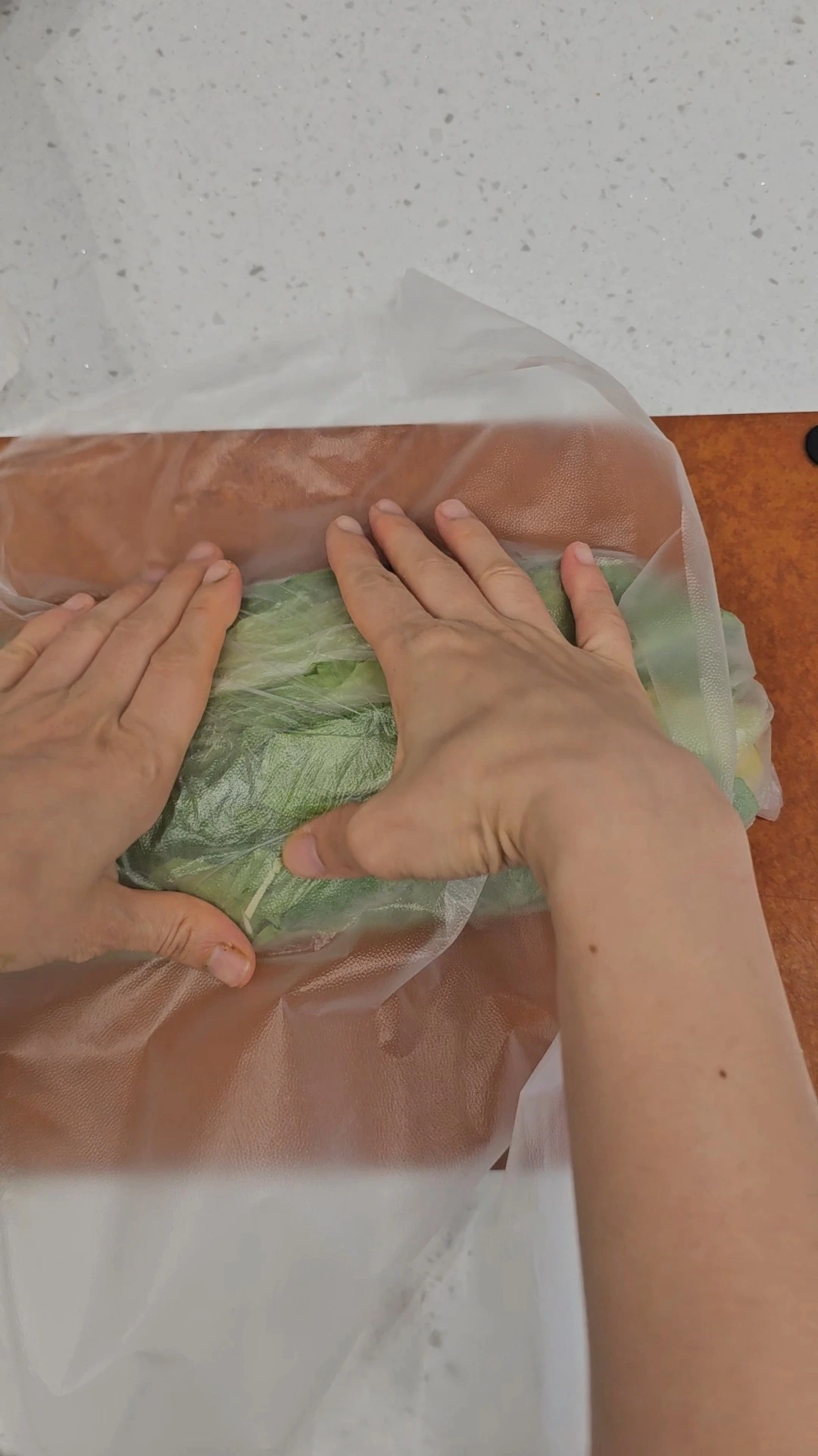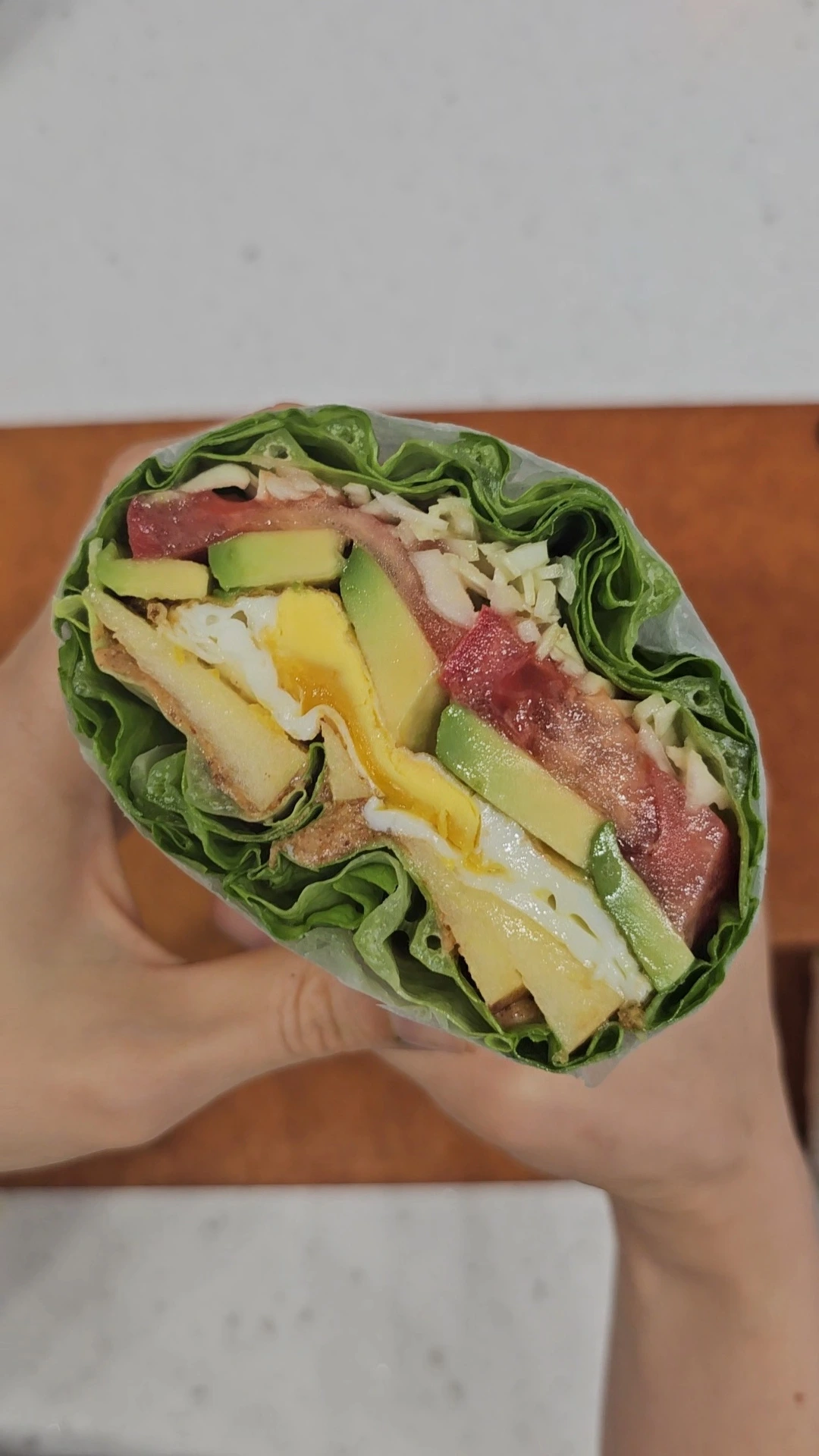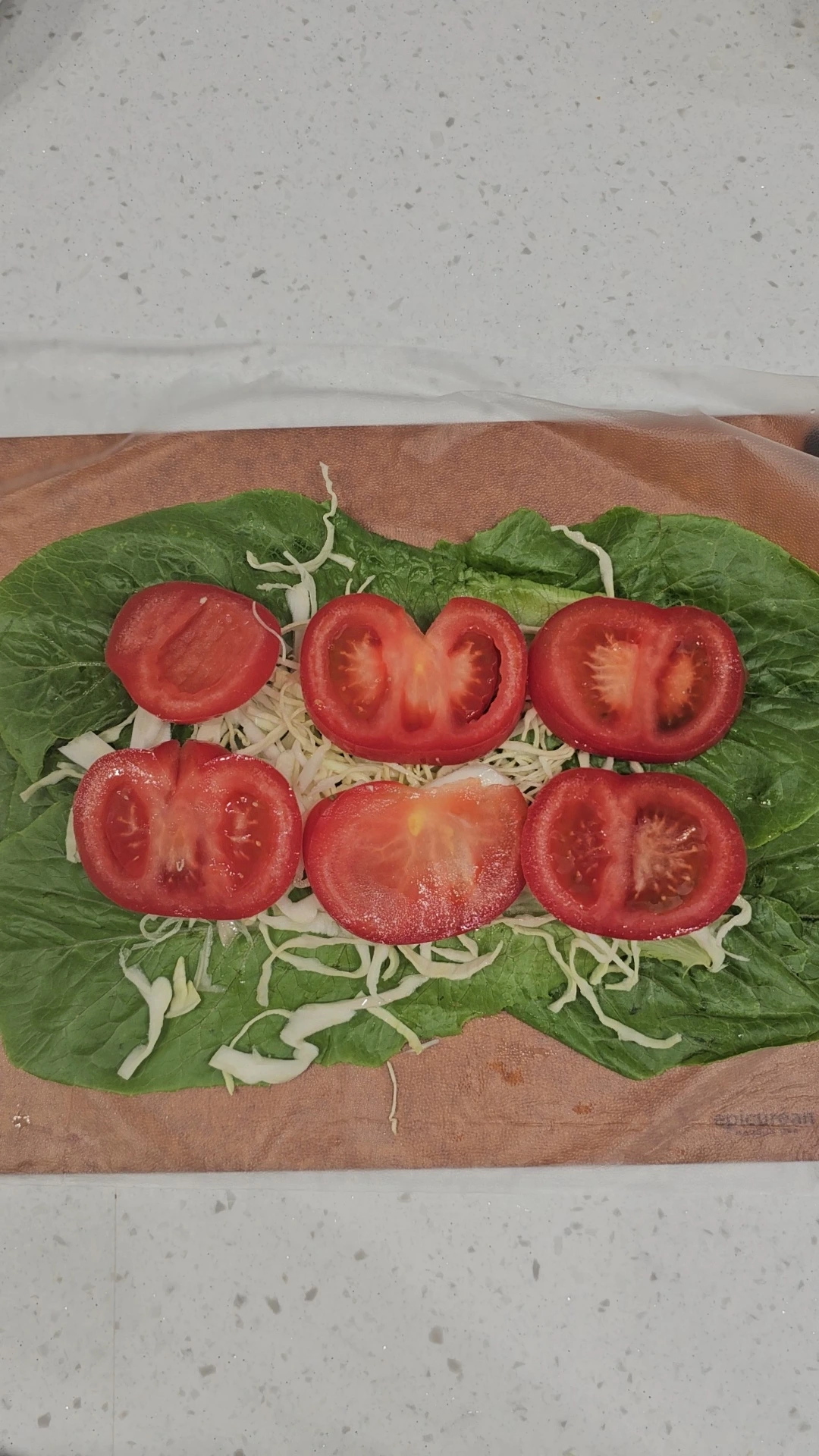 랩의 접착면이 밖으로 가도록 한 후 잎이 넓은 상추를 깔아준다. 상추는 깨끗하게 손질 후 야채 탈수기에 넣어 물기를 제거한다. 랩 위에 상추를 올린 후 키친타월을 이용하여 한번 더 꼼꼼하게 물을 닦아준다. 이후에는 준비된 속재료를 올려준다. 속재료 역시 물기 제거한 후 차곡차곡 쌓아준다. 드레싱은 겉면 가까이, 잎 쪽에 바른다. 드레싱은 양쪽 잎에 발라도 되지만 나는 드레싱 양을 줄이기 위해 한쪽 면에만 넣어주었다. 마지막으로 상추로 뚜껑을 만들어 닫아준다. 이제 가장 중요한 순서가 남았다. 바닥에 깔린 글래드 랩으로 돌돌 말아 포장하면 완성된다. 이때 손을 야무지게 돌려가며 꼭꼭 포장한다. 겉면에 접착제가 붙어 있는 글래드 랩을 이용하면 한결 수월하다.