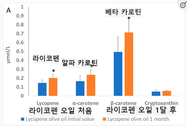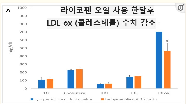 토마토의 유익한 성분인 라이코펜, 베타카로틴은 기름에 잘 녹는 지용성으로 기름과 섭취할 때 흡수율이 높아진다. 2023년도에 발표된 논문 2)에 의하면 라이코펜 오일 (토마토 추출물을 포함한 올리브 오일)을 한 달간 먹었을 때 라이코펜과 알파, 베타카로틴의 농도가 크게 높아졌다. 이로 인해 고지혈증이 있는 실험 대상자에서 체내 항산화 능력은 높아졌고 산화 스트레스 수치는 감소했다. 산화된 LDL 콜레스테롤도 상당히 많이 떨어지는 결과가 관찰되었다. 연구 결과 2006년도에 발표된 논문3) 과 비슷하게 고지혈증 환자에서 라이코펜이 풍부한 토마토와 올리브 오일을 함께 먹으면 관상동맥 질환의 위험을 낮출 수 있음을 시사한다.