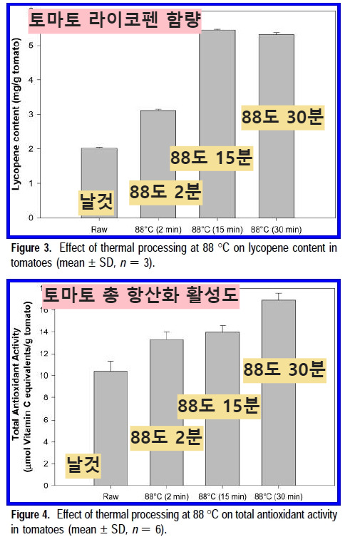 토마토의 항산화 효과는 익혀 먹을 때 증가한다. 2002년 보고한 연구에 의하면 4) 온도가 증가할수록 라이코펜 함량이 크게 높아졌다. 물론 비타민 C 손실은 관찰되었지만 항암 한산화 성분 풍부한 라이코펜은 크게 증가했고, 폴리페놀 및 플라보노이드 함량에는 큰 차이가 없었다. 총 항산화 활성도는 토마토를 88도씨로 30분간 익혀 먹었을 때 가장 높았다.