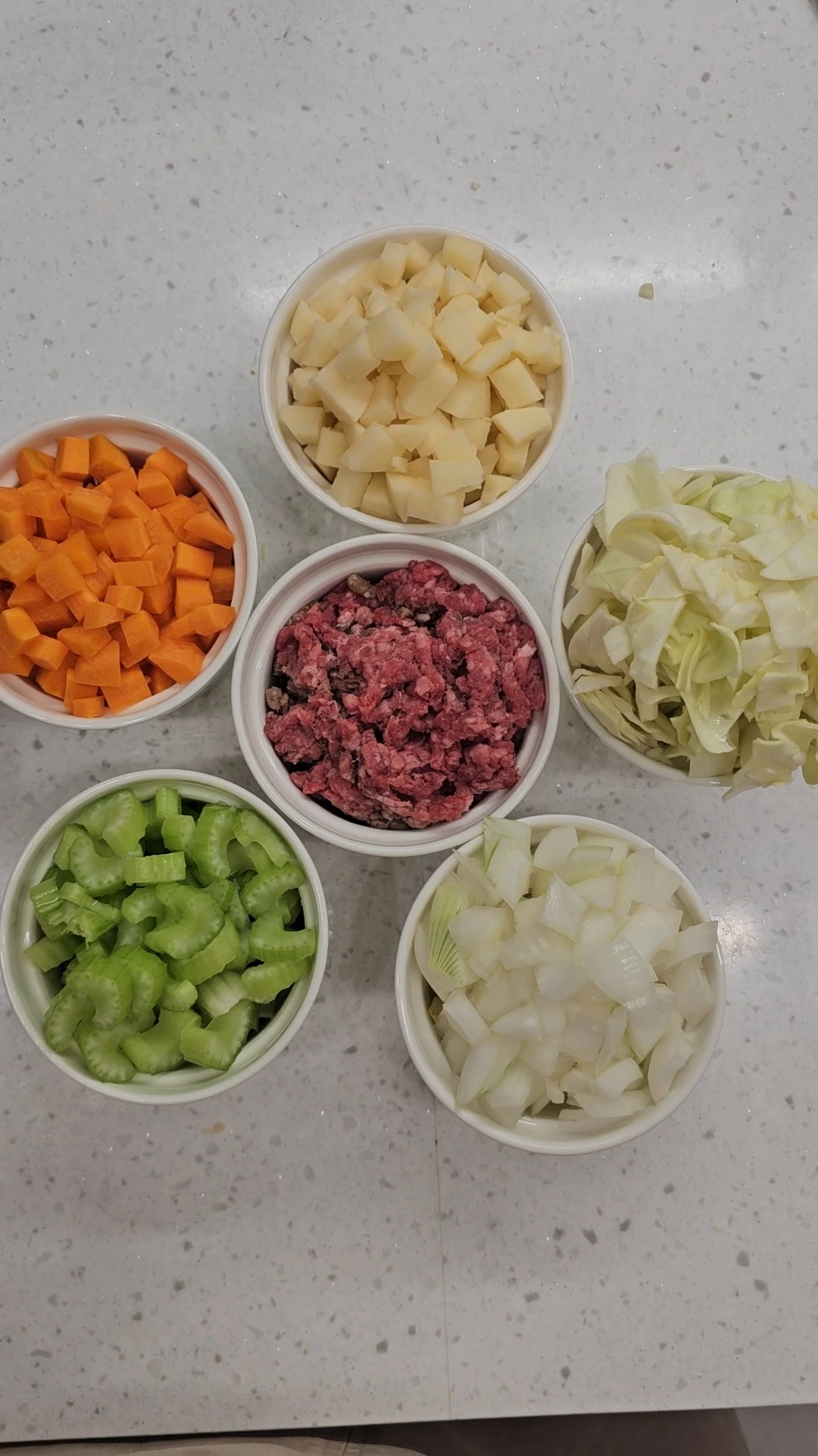 (옵션 1 ) 다진 소고기 다진 마늘 생강청 (옵션) 양파 당근 감자 샐러리 양배추