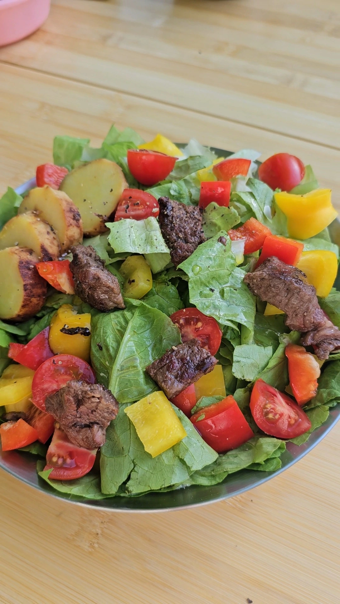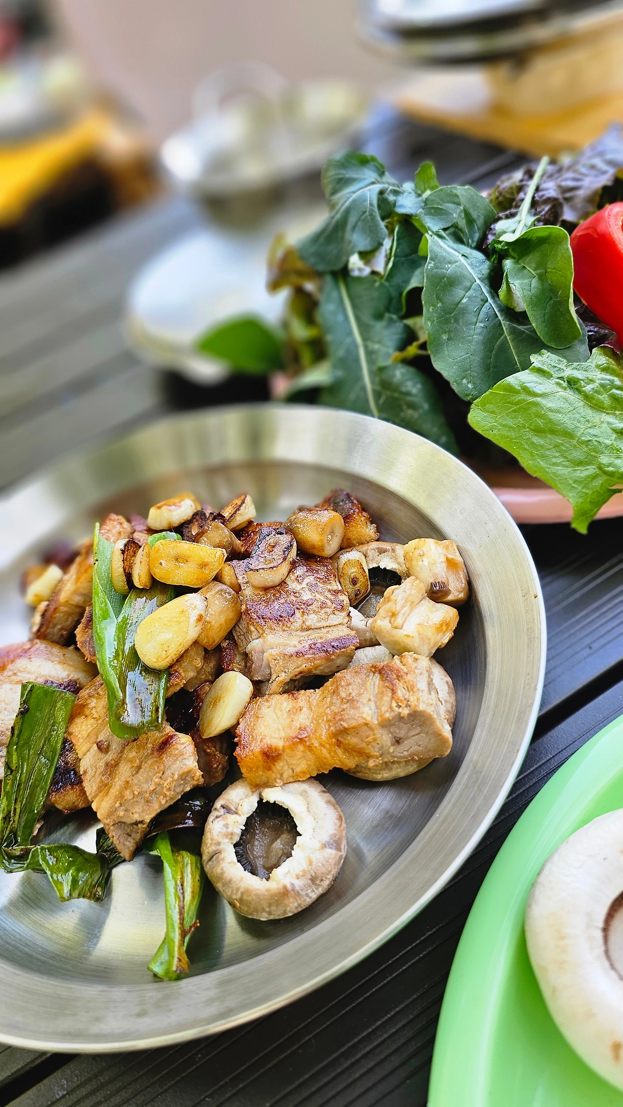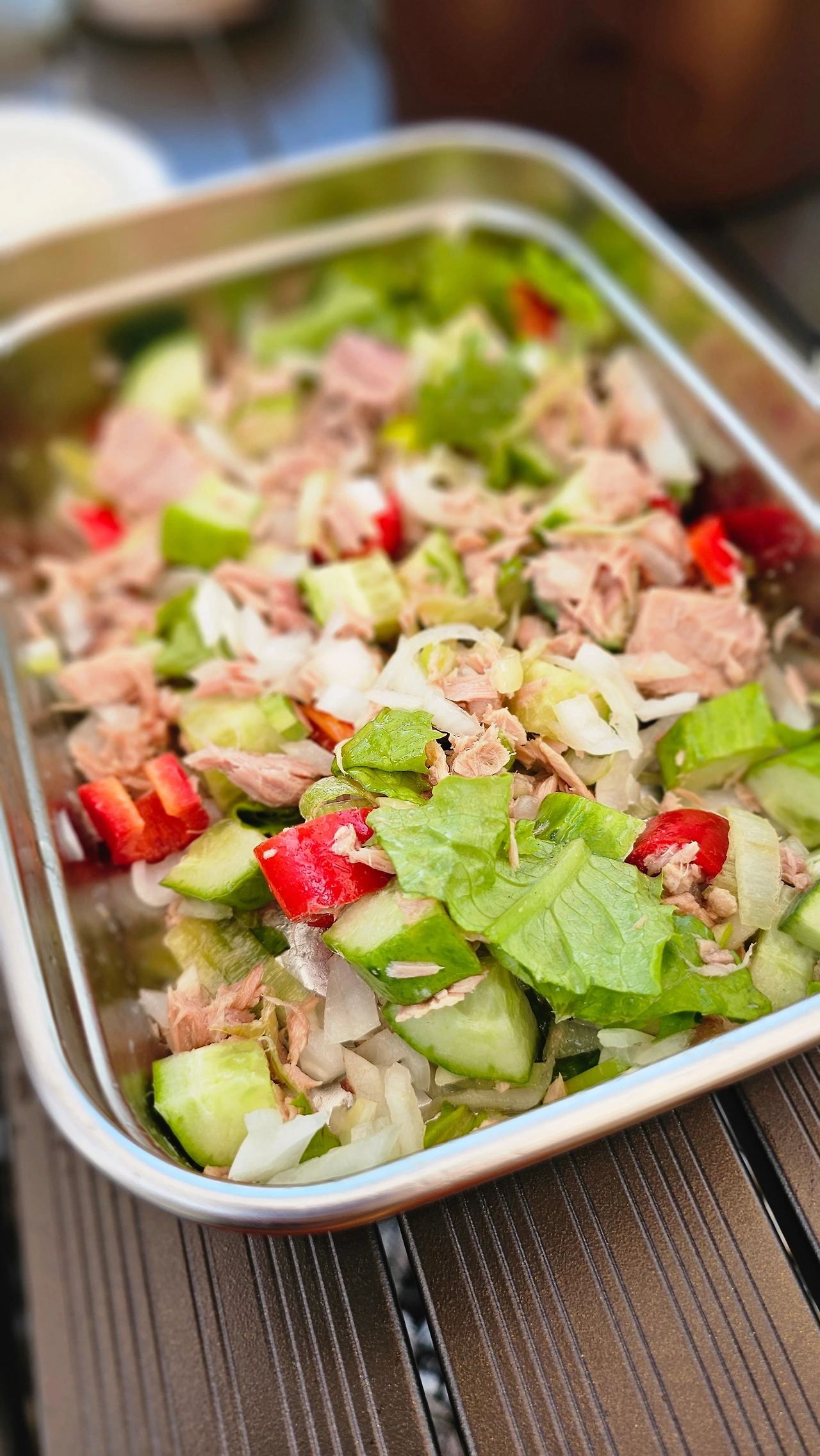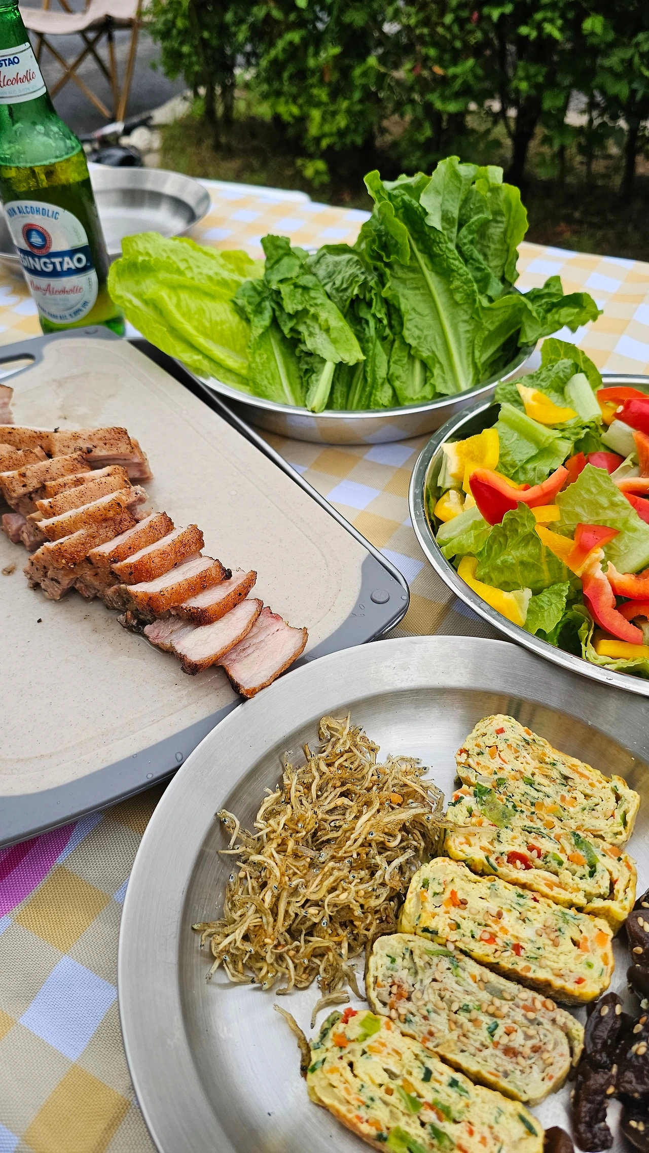 캠핑 갈 때 냉장고 터는 건 나뿐만이 아닌지 함께 간 친구도 집에 있던 반찬을 죄다 챙겨 왔다. 나와서 먹는 건 뭐든 맛있는 법으로 야채도 예외는 아니다. 야채는 다듬고 썰어서 쌈 야채나 안주 삼아 그냥 먹는다. 자투리 채소는 샐러드를 만든다. 샐러드드레싱은 따로 없이 올리브 오일에 소금 후추만 뿌려 먹는다. 전날 먹다 남은 고기나 군고구마, 함께 챙겨 온 참치 캔을 넣기도 한다. 별거 넣은 거 없는데도 계속 손이 가는 맛이다.