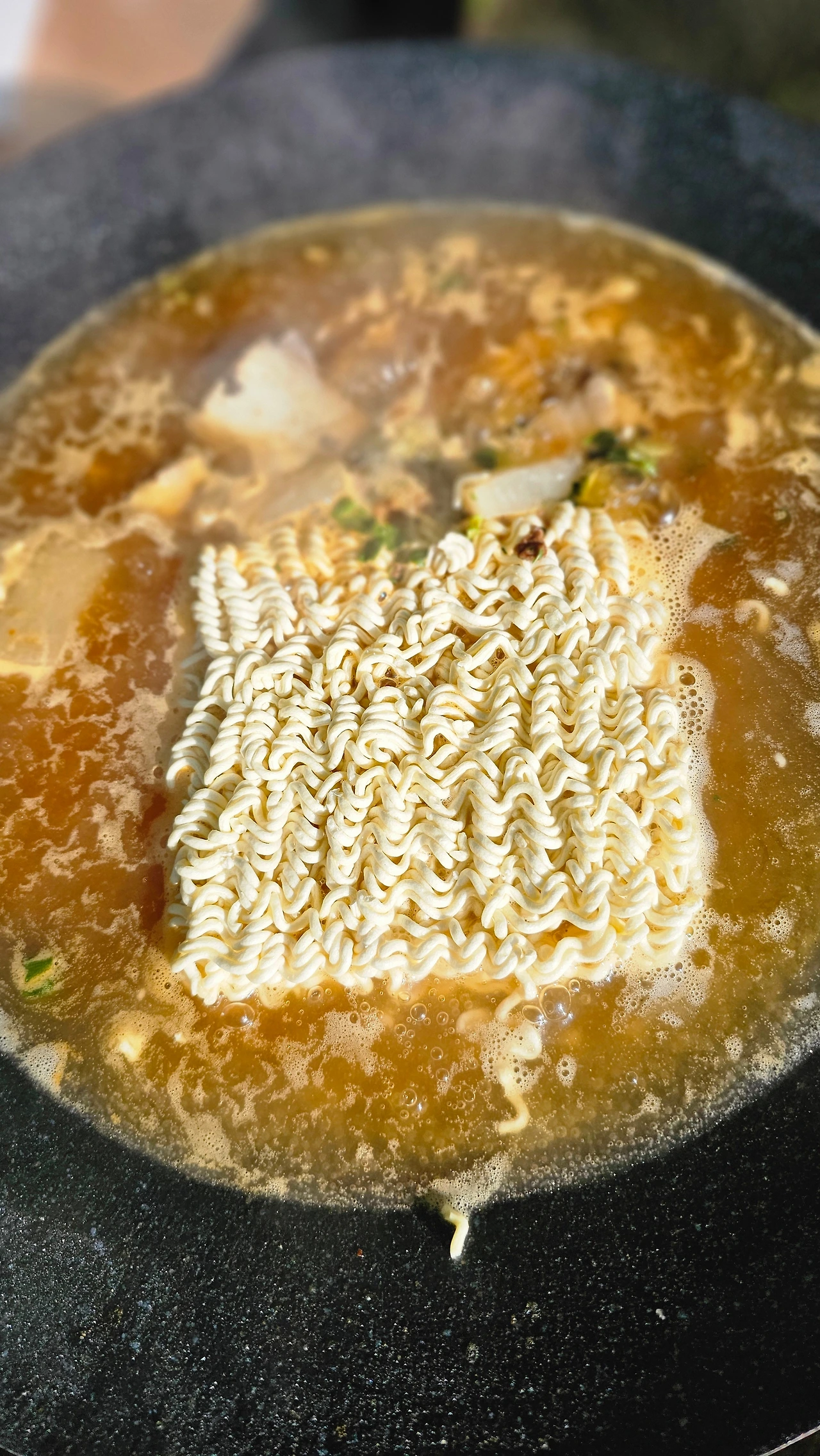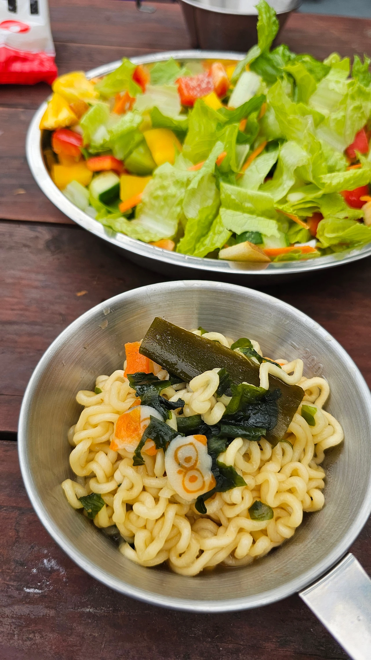 아이에게 캠핑은 우리 집 공식 라면 먹는 날이다. 캠핑을 몇 번 다녀온 이후로 아이에게 캠핑에서 무엇이 가장 좋았냐고 물어보니 라면이라고 한다. 숲 속에서 개구리 잡고 물놀이했던 것보다 더 좋았던 것이 라면이라니 조금은 충격이었다. 우리 집에서 라면을 먹지 않는다. 초가공 식품의 끝판왕에 있는 라면을 일부러 피하는 것이다. 하지만 캠핑은 예외다. 캠핑에서 라면을 빼면 왠지 섭섭하다. 하룻밤 자고 난 다음 날 아침엔 누룽지와 함께 라면을 먹는다. 라면은 수프는 반 만 넣어 끓이고 대파나 콩나물이 있으면 함께 넣는다. 라면에 부족한 영양소는 전날 먹다 남은 자투리 야채로 샐러드 만들어 함께 먹는다.