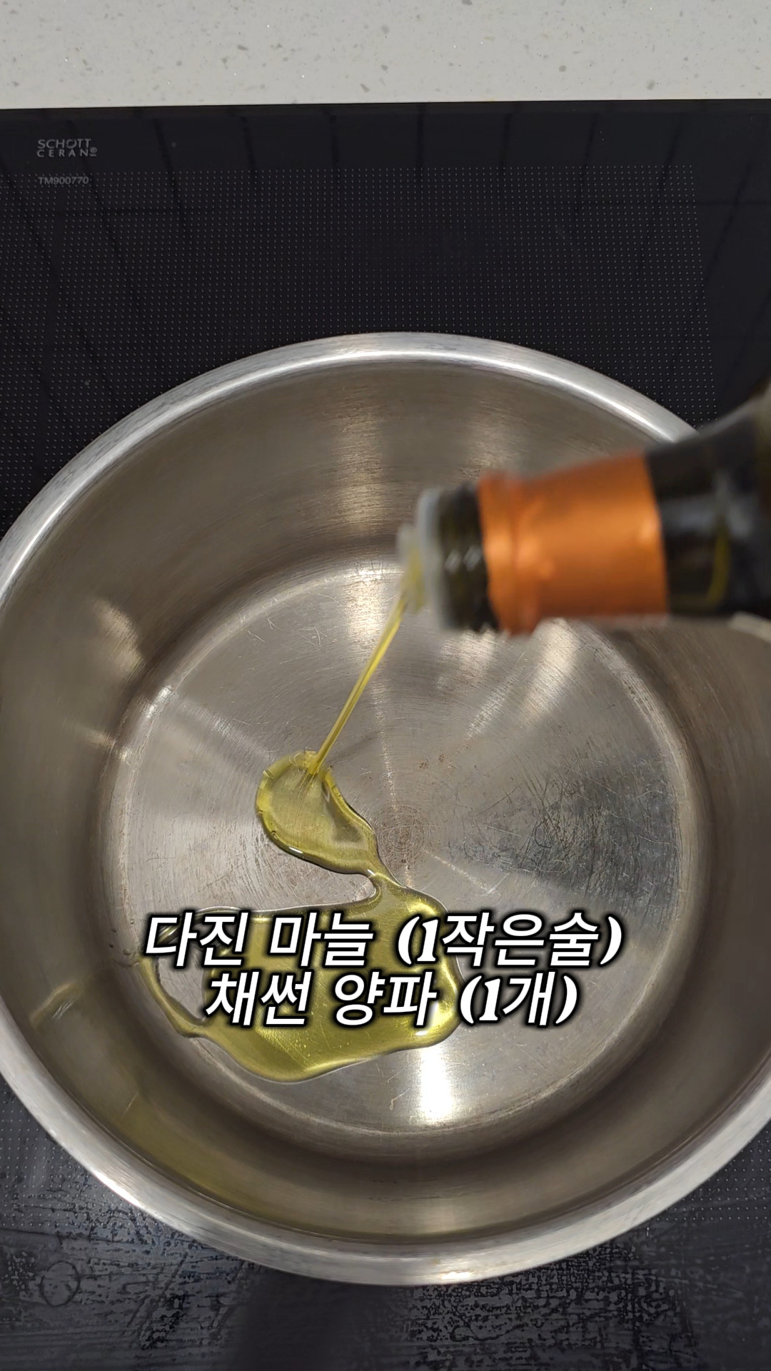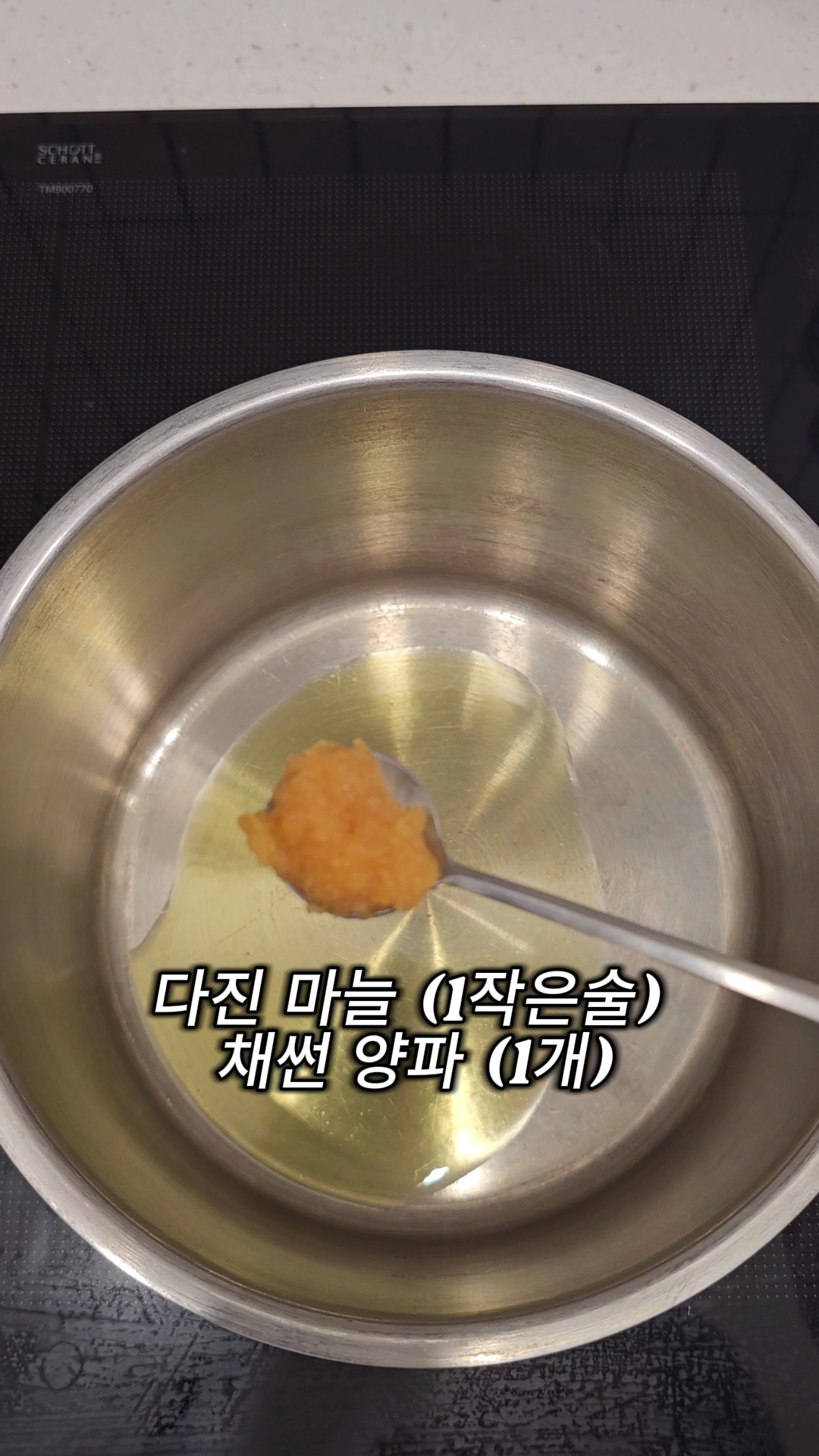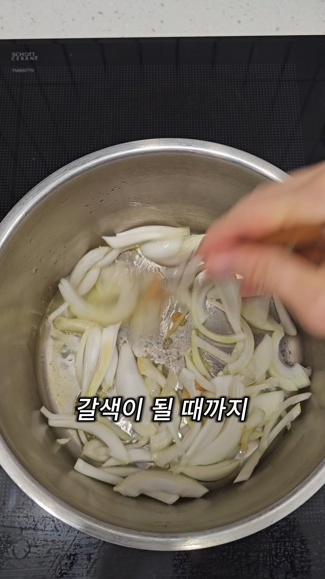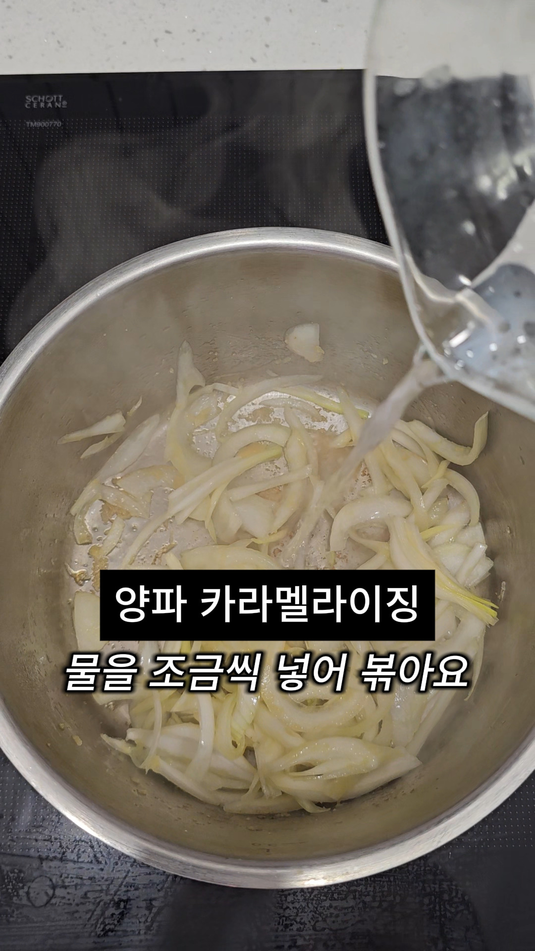 4. 올리브 오일에 다진 마늘과 채 썬 양파를 볶는다. 양파를 갈색빛이 될 때까지 캐러멜라이징을 하면 요리의 풍미가 올라가 맛있어진다. 양파 캐러멜라이징 할 때 물을 부어가면서 하면 타지 않고 쉽게 된다.