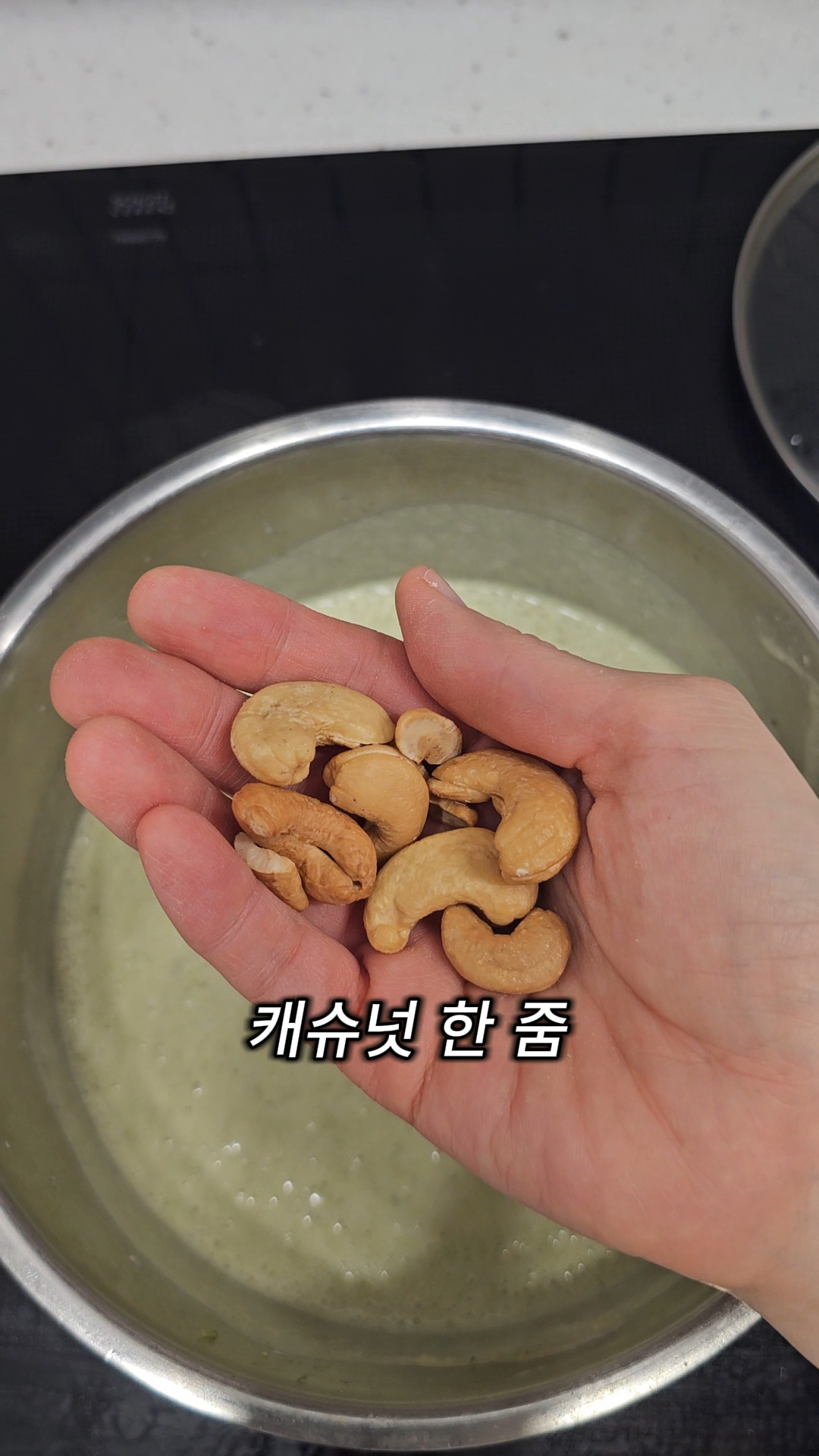 7. 코코넛 밀크 400 ml를 넣어준다. (남은 그릇에 있는 코코넛 밀크 클렌징하기 위해 물 100 ml 추가한다.) 8. 캐슈너트를 넣으면 고소함이 추가된다.