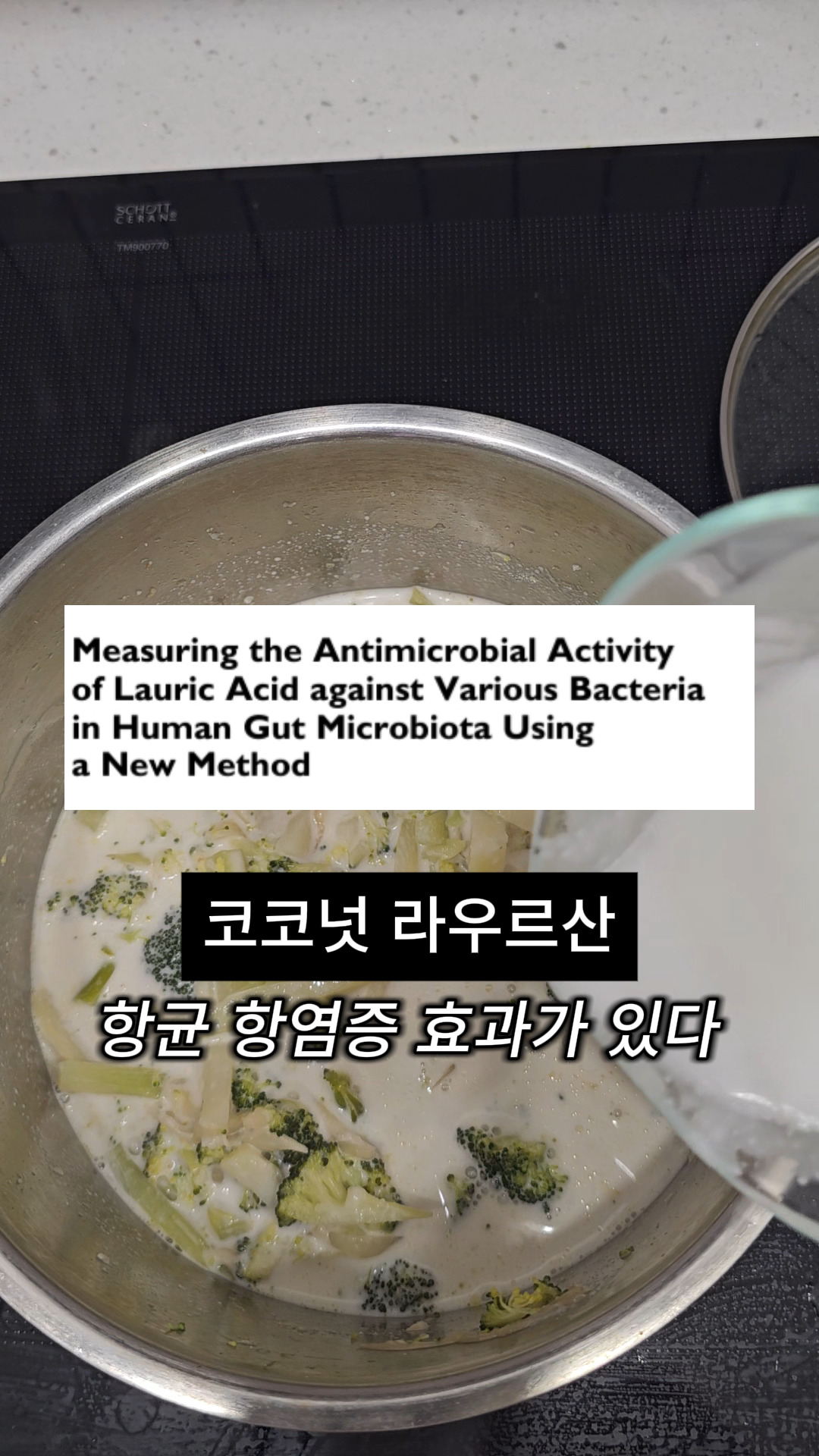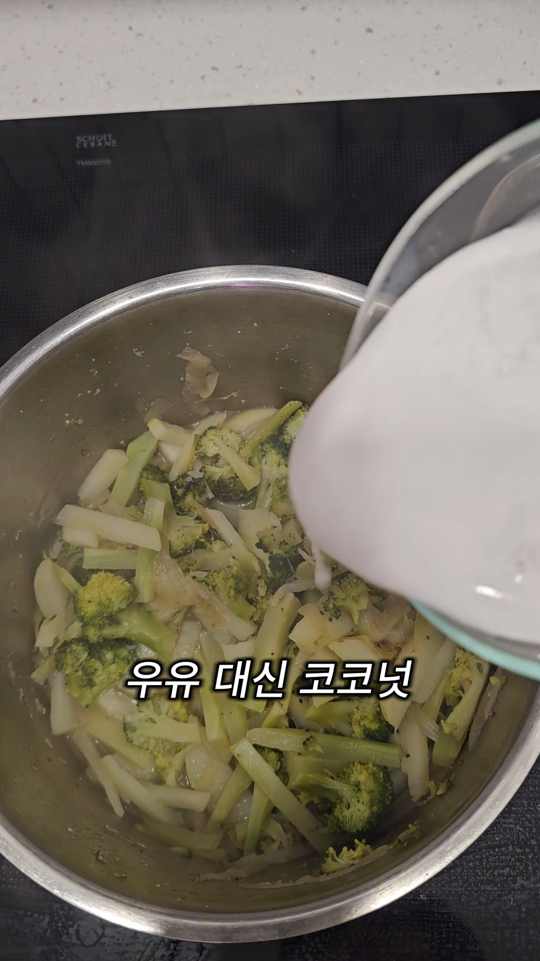 세 번째. 코코넛 밀크를 사용했다. 오늘 소개하는 브로콜리 감자 수프는 생크림이나 우유 대신 코코넛 밀크를 사용했다. 코코넛 밀크는 코코넛 과육을 짜서 얻은 것으로 식물성 제품이다. 우유 빛깔로 우유나 생크림 대신 사용할 수 있다. 코코넛 밀크에는 중쇄 지방산이 풍부하다. 빠르게 에너지를 공급한다. 장쇄 지방에 비해 지방으로 저장될 가능성이 적다. 포만감이 높아 식욕을 감소시켜 주고 체중 관리에도 도움을 줄 수 있다. 무엇보다 코코넛 밀크의 주요 지방인 라우르산은 항균 및 항염증 특성을 가지고 있다. 감염과 싸우고 신체의 염증을 줄이는 데 도움이 될 수 있다.
