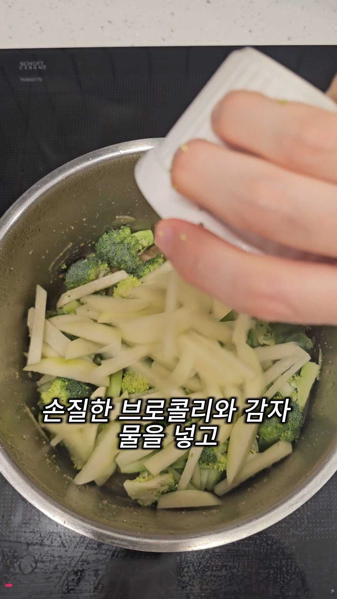 5. 손질한 브로콜리, 감자를 넣어 주고 섞는다.