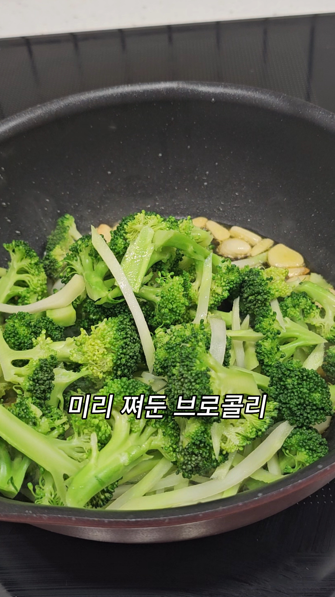 5. 마늘이 황금색이 되면 쪄둔 브로콜리를 넣고 슬쩍 볶는다.
