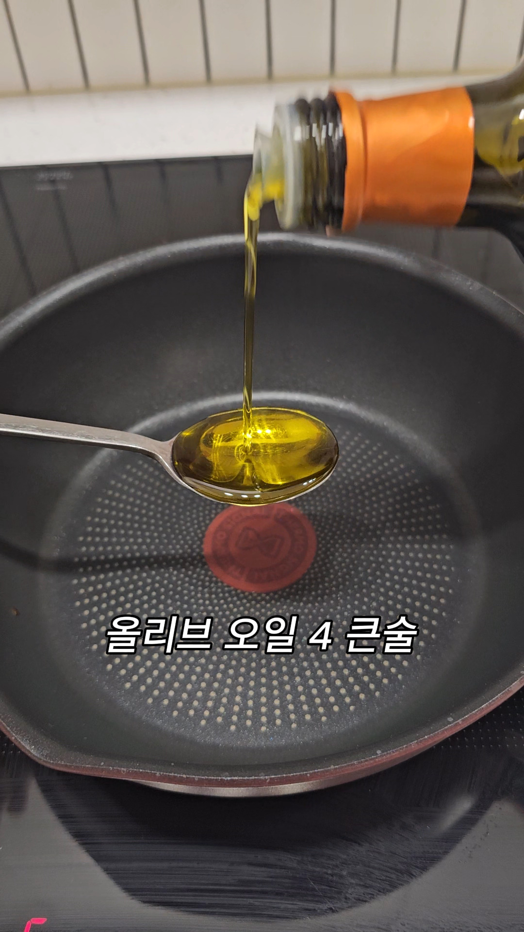 3. 예열된 팬에 올리브 오일 4큰술을 넣는다.