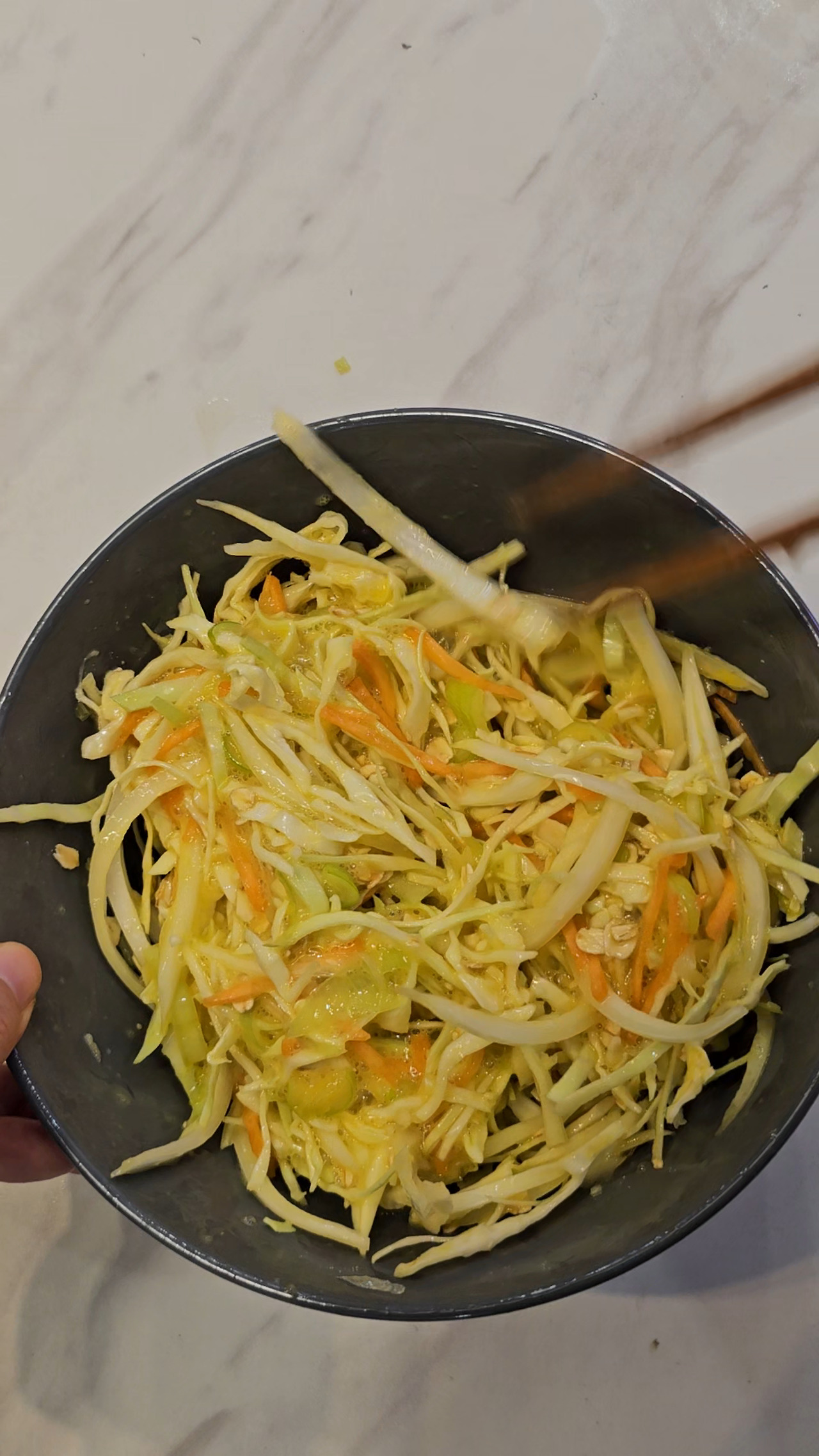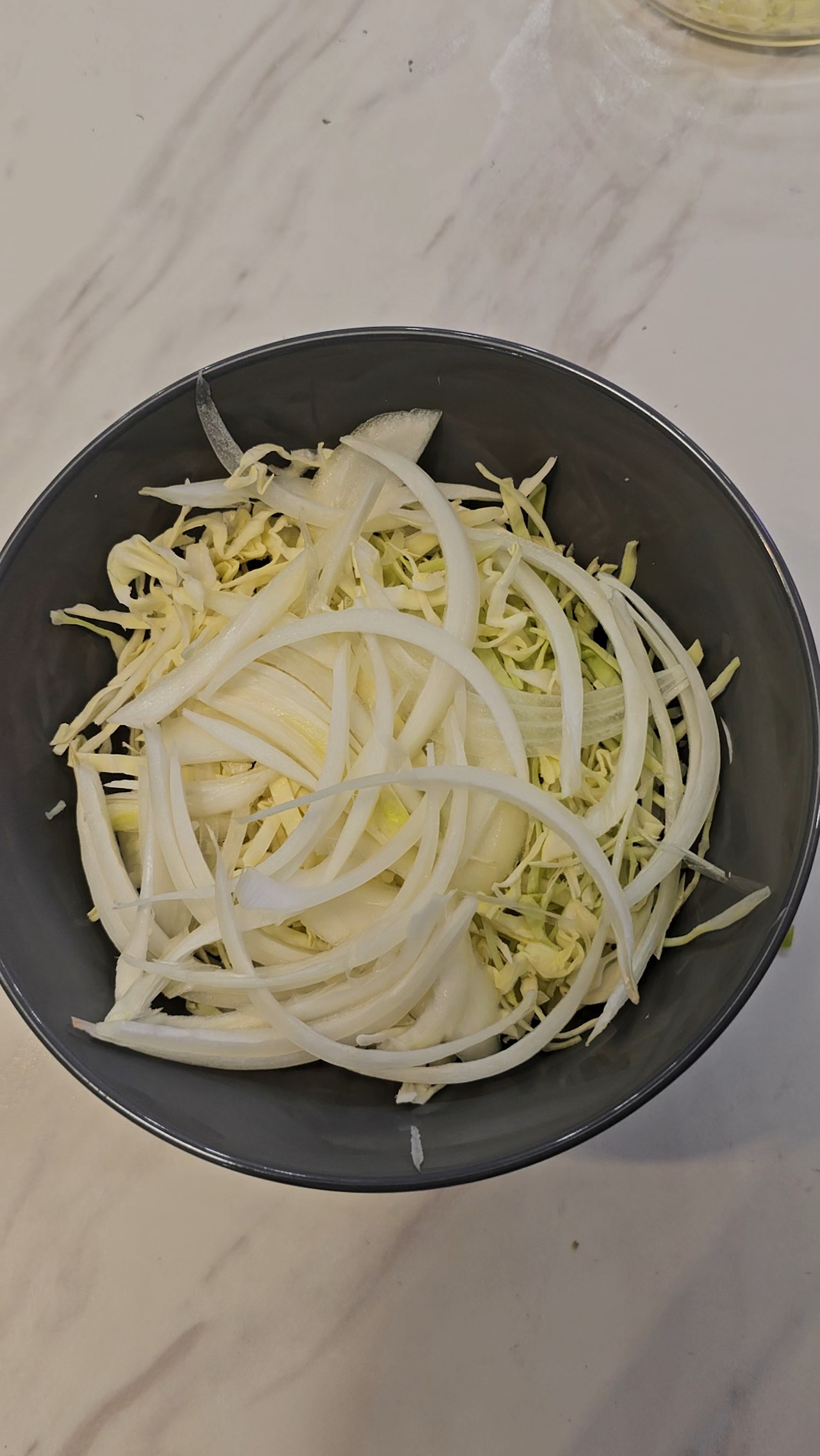 양배추를 더 곱게 썰수록 식감이 부드러워진다.