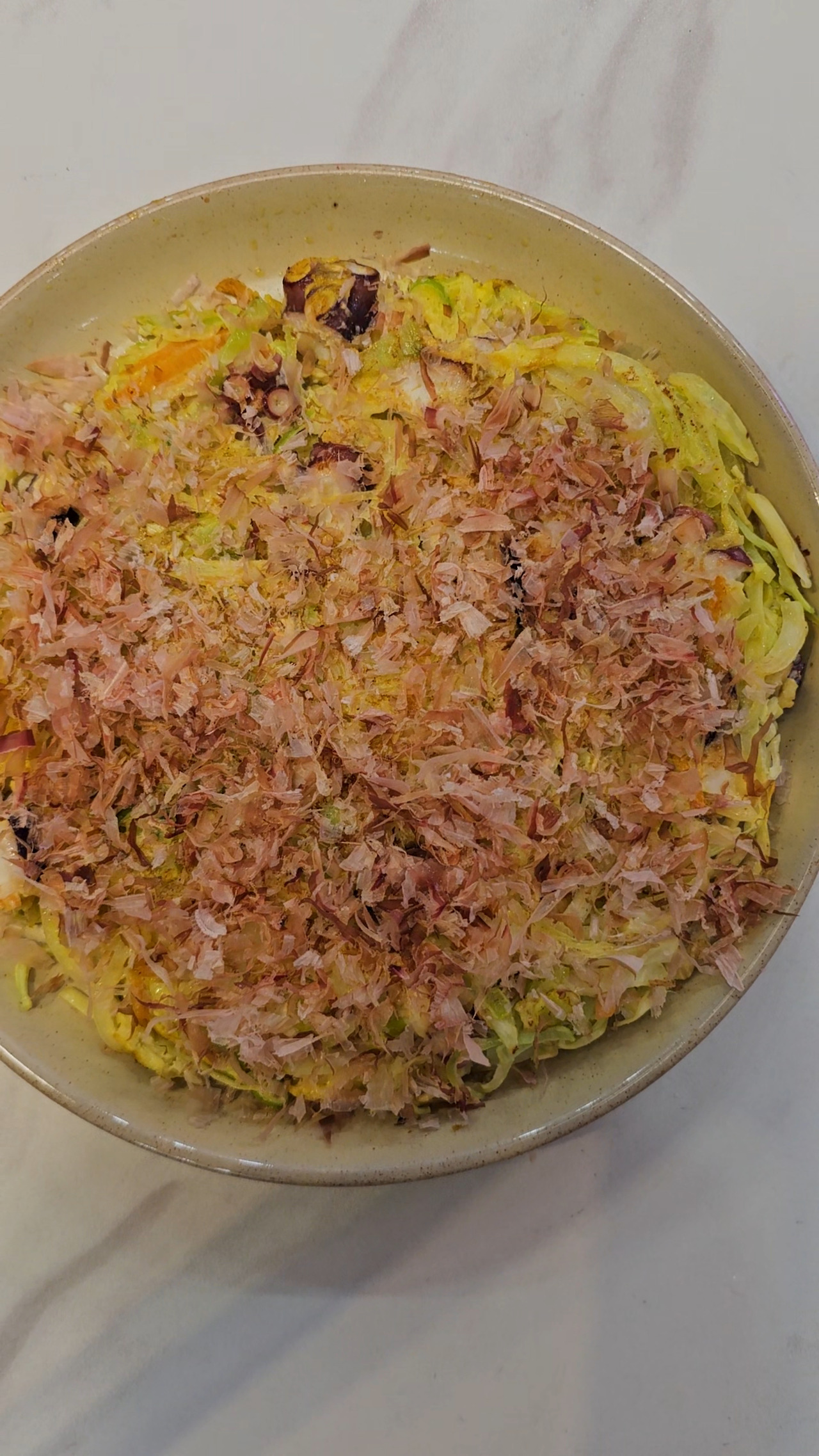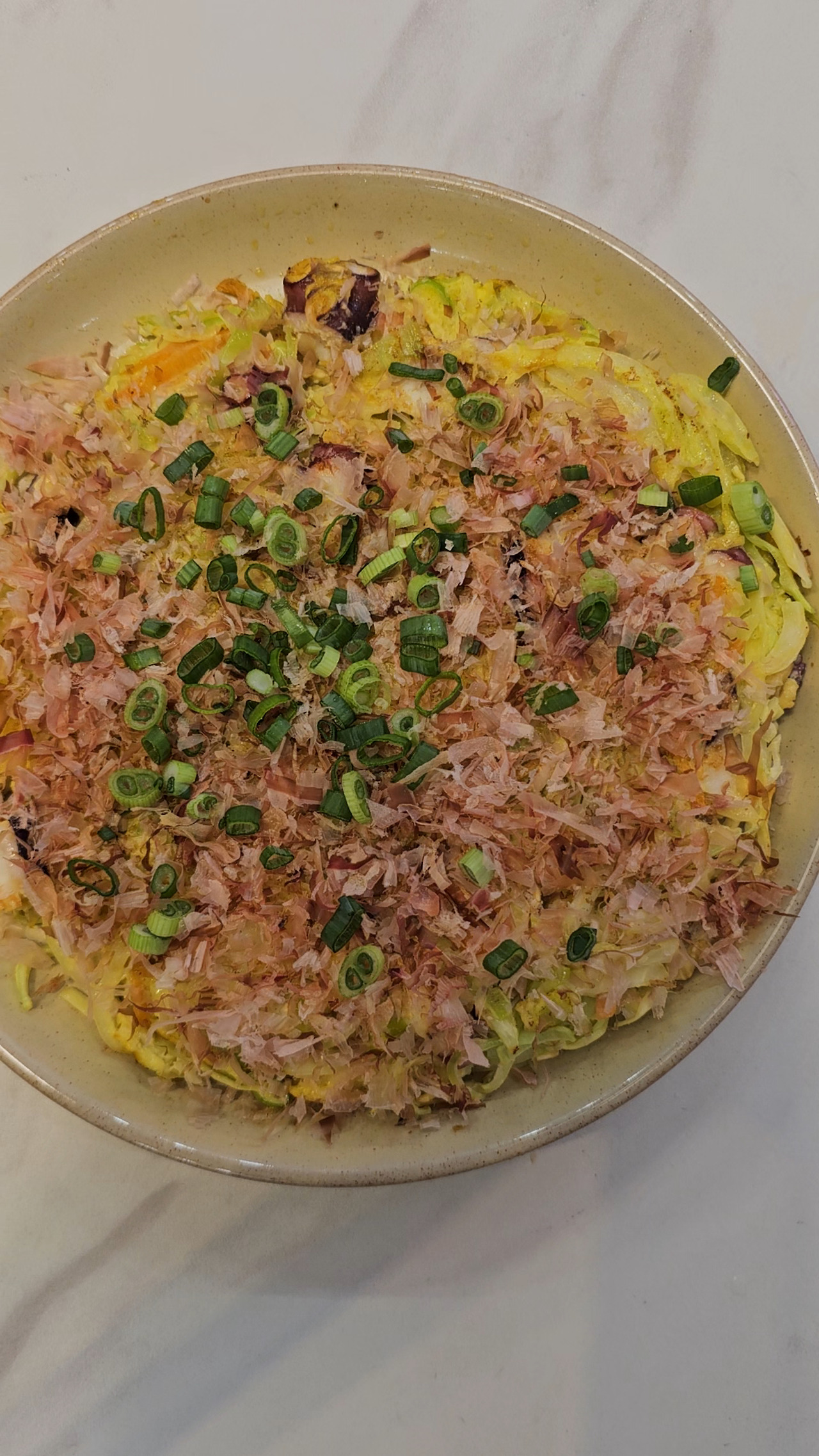 건강 식재료를 섞어 부쳐주기만 했는데도 맛은 놀랍도록 맛있었다. 노릇 바삭하게 구워진 표면과 촉촉한 속, 양배추와 양파의 은은한 단맛, 오트밀의 구수함, 문어의 쫄깃함이 어우러져 풍미가 깊었다. 가쓰오부시의 감칠맛(감칠맛의 주성분인 글루탐산은 포만감 신호 전달에도 도움이 된다)은 건강식 재료가 가질 수 있는 밋밋함을 한 번에 날려버렸다. 마지막으로 쪽파의 알싸함이 기름진 느끼함을 잡아줬다.