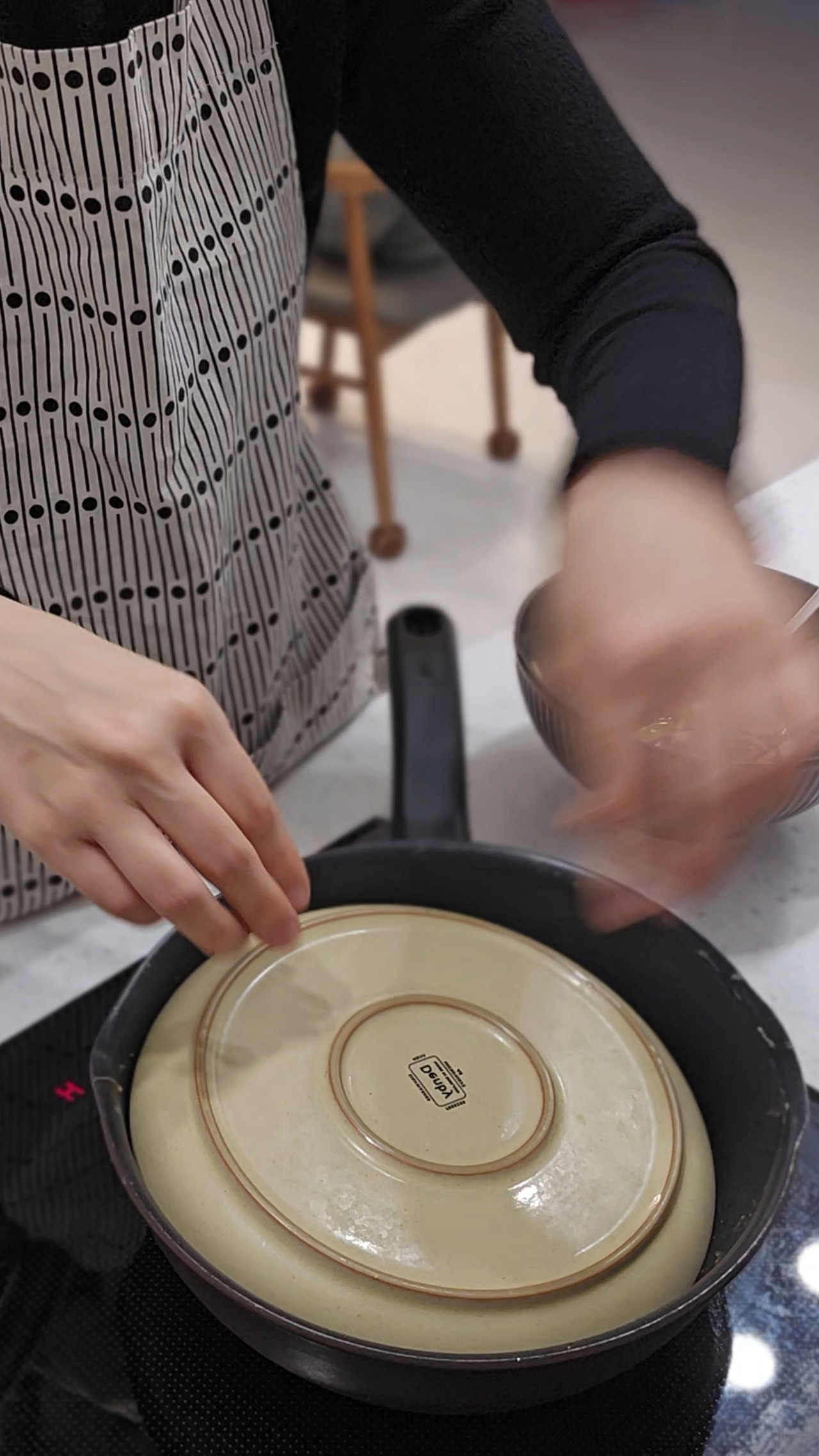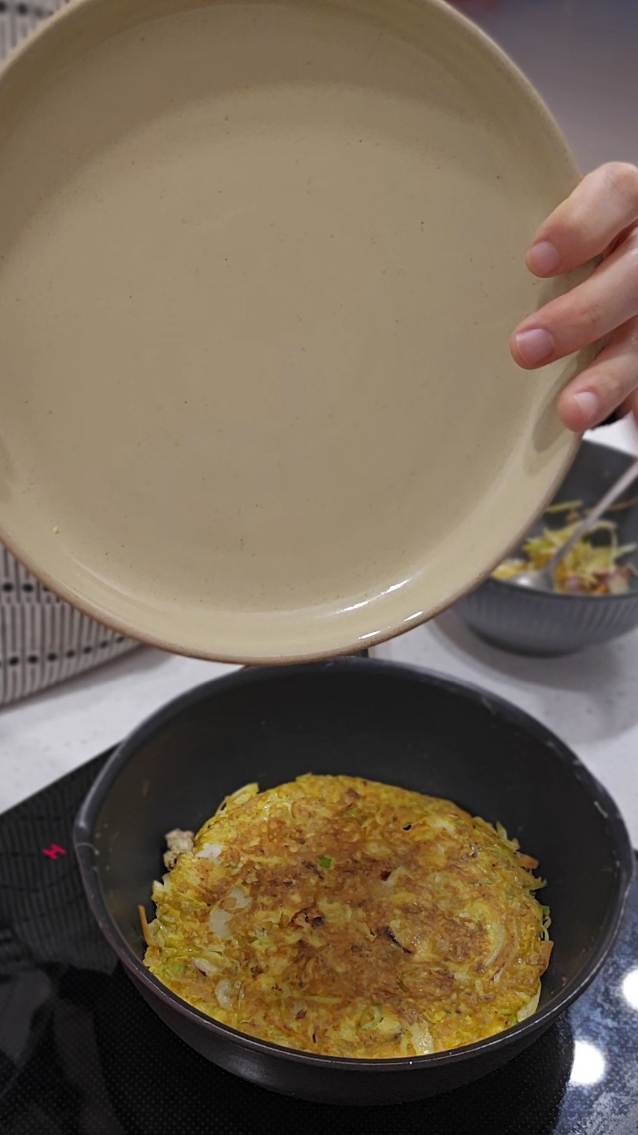 4. 섞은 재료를 팬에 올려 동그랗게 모양을 잡는다.