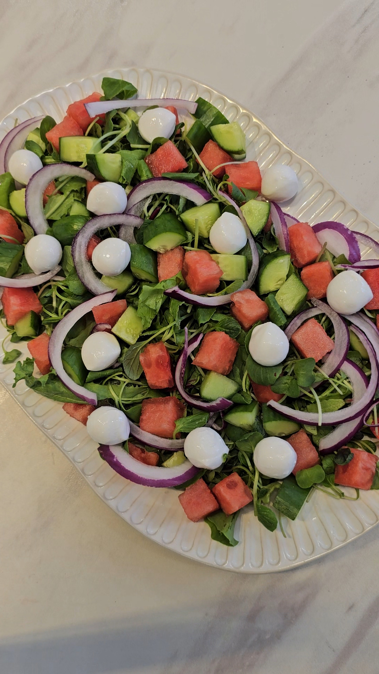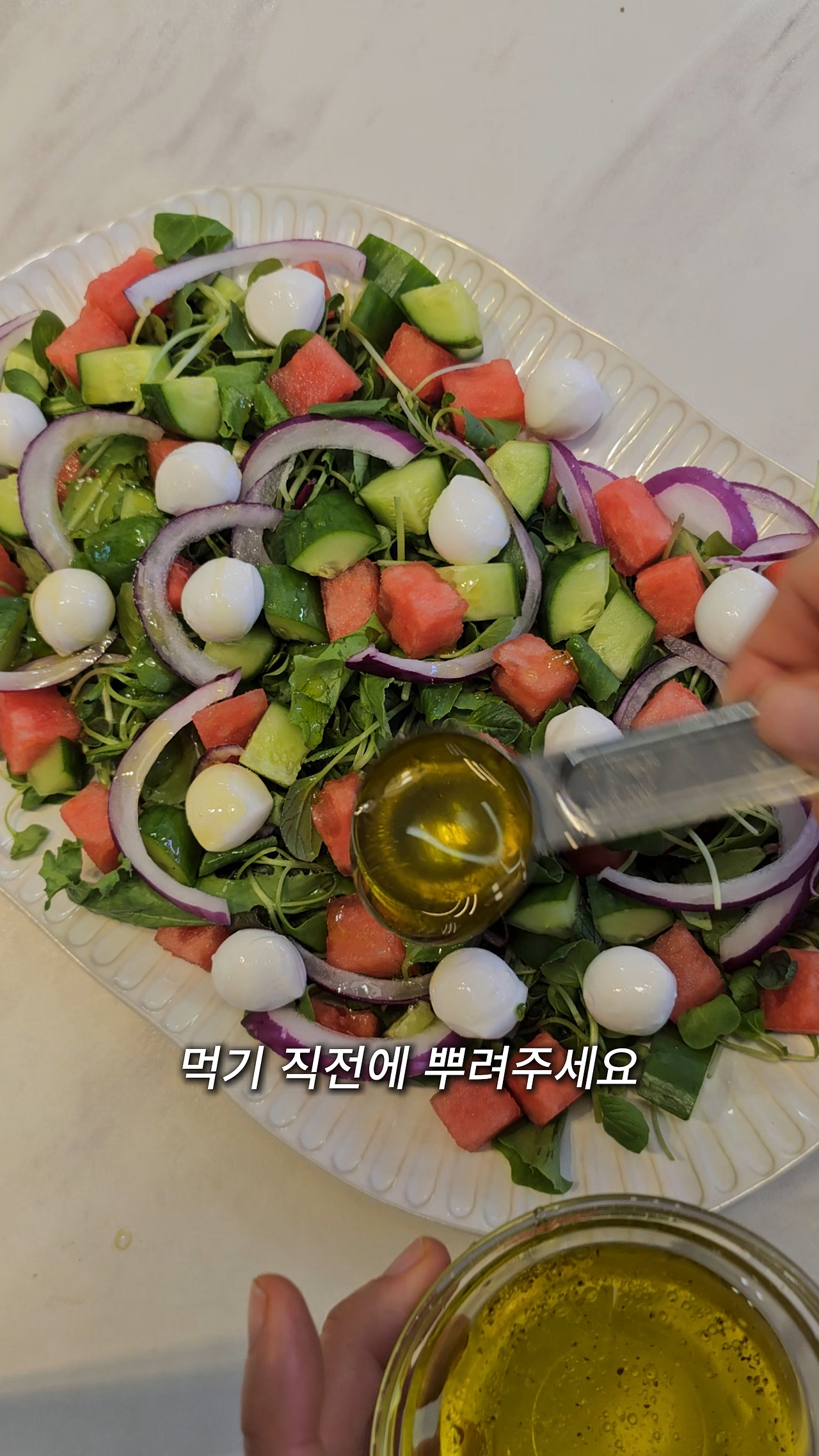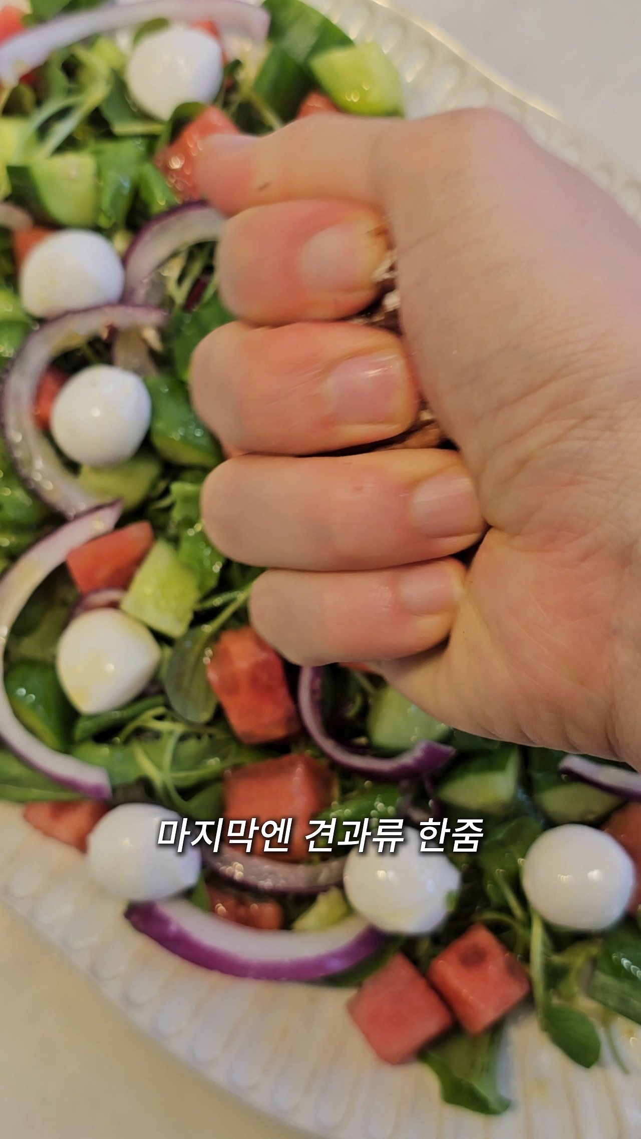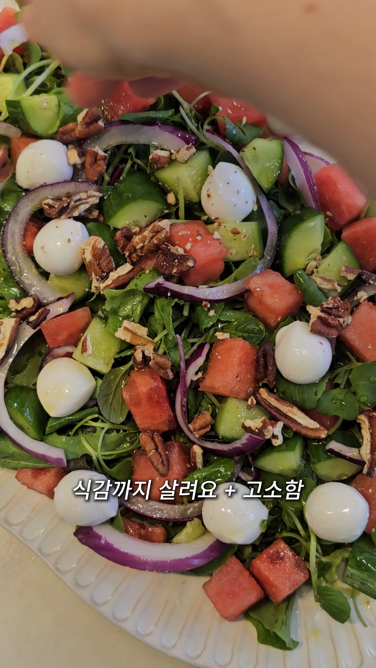 수박 살에 채소와 견과류, 건강한 드레싱을 얹어보세요.
