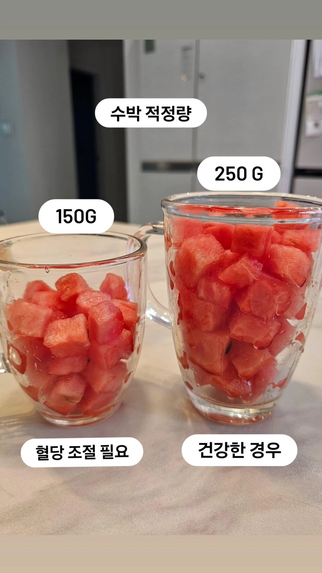 혈당 조절이 필요한 경우에는 수박 권고량은 1쪽 이하다. 평균 150 g 정도로 한 컵 분량에 해당한다. 하지만