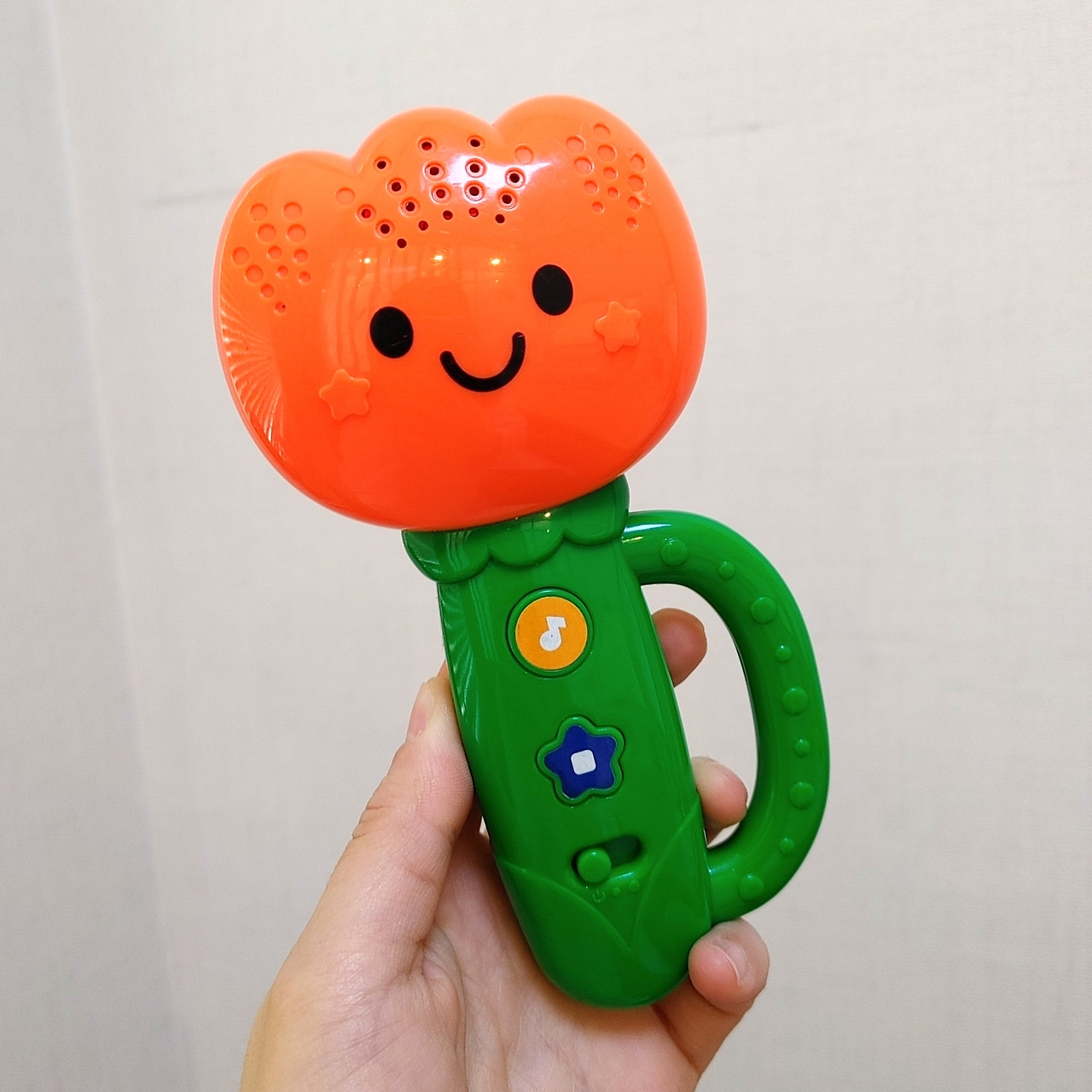 주황색 튤립으로 말할 것 같으면, 깜빡거리는 주황색 불빛과 함께 동요 다섯 곡 정도가 자동 재생되고, 장난감을 흔들면 띠용 띠용 하는 귀여운 효과음까지 나는 만능 장난감이다.