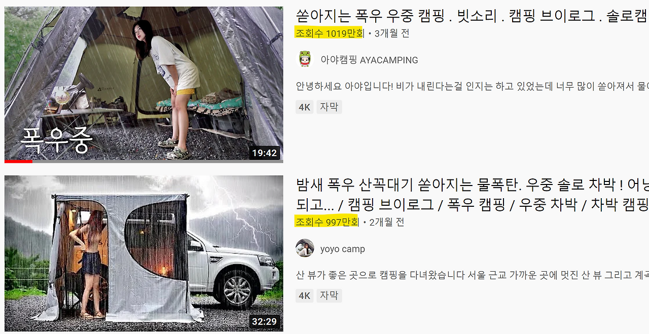 해외여행이 뜨면 필연적으로 죽을 수밖에 없는 카테고리가 있습니다. 국내 아웃도어 카테고리입니다. 캠핑, 백패킹, 낚시, 등산 등 전체적으로 조회 수가 빠지고 있어요. 몇 개월 전 장마철만 해도 아야캠핑님의 폭우 캠핑 영상이 조회수 1,000만 넘었죠. Yoyo camp님의 영상도 997만 입니다. 이외 Rirang OnAir님도 742만, 류캠프님도 727만, 조조캠핑님도 472만 등 '폭우 캠핑'은 대박 콘텐츠였죠. 하지만 현재 아웃도어 쪽 조회수가 빠지는 현상은 어쩔 수 없습니다. 해외여행이 막혔을 때는 국내 여행지로 눈을 돌렸지만, 이젠 해외여행을 갈 수 있으니까요.