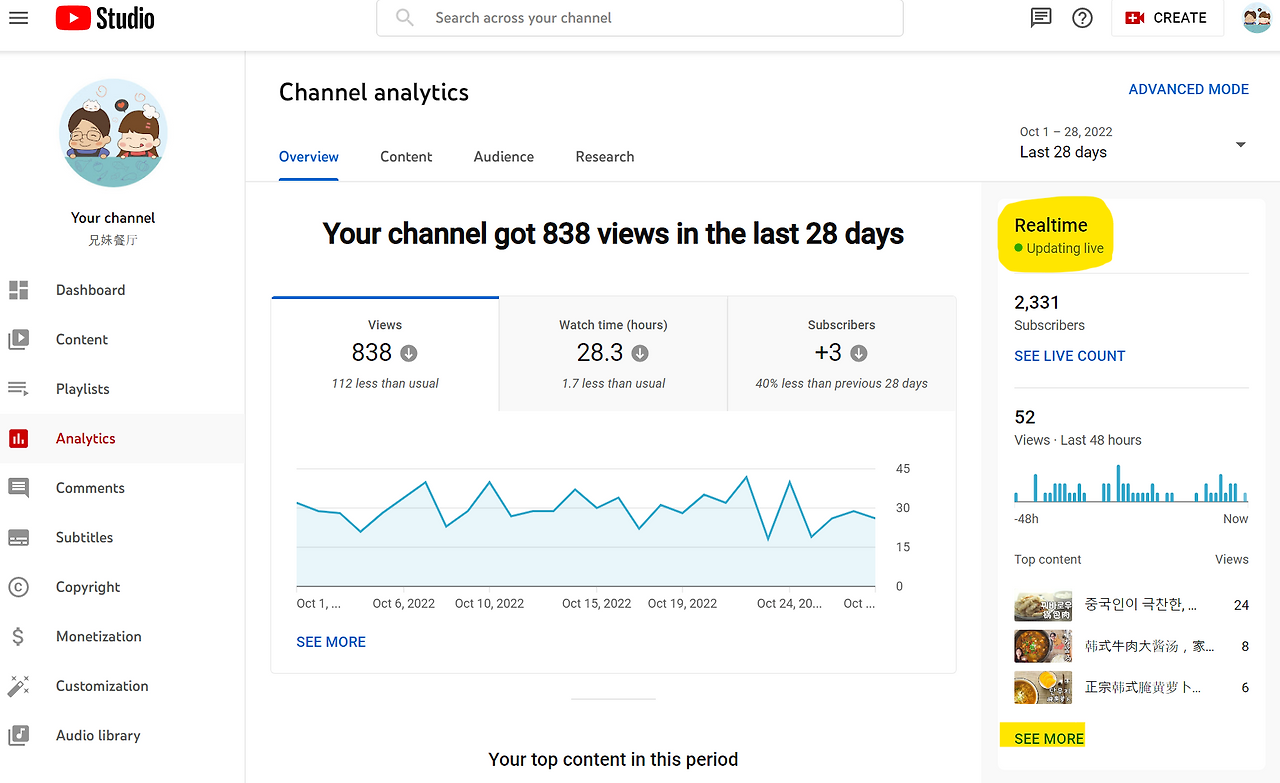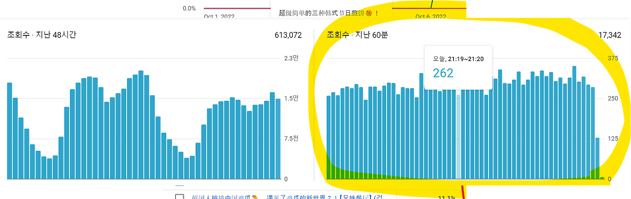 마지막으로 심화 버전을 말씀드리겠습니다. 여유 되신다면 썸네일을 2-3개 준비하는 것도 좋습니다. 유튜브 스튜디오를 들어가자마자 오른쪽 상단에 ‘실시간(Realtime) 조회수’가 있습니다. 거기서 ‘더 보기’를 클릭하시면, 왼쪽에 ‘지난 48시간’ 조회수와 오른쪽에 ‘지난 60분’ 조회수가 나옵니다. ‘지난 48시간 조회수’에서는 1시간당 조회수를 볼 수 있고, ‘지난 60분’ 조회수에서는 분당 조회수를 볼 수 있습니다. 여기서 ‘지난 60분’ 조회수를 보는 겁니다. 영상을 업로드할 때마다 ‘지난 60분’ 조회 수가 다 다르게 나옵니다. 그럼 이 ‘지난 60분’의 분당 조회수 평균값이 있을 겁니다. 그 평균값을 잘 기억해두신 뒤, 새로 업로드한 영상의 분당 조회수와 비교해 보세요. 새로 업로드한 영상의 분당 조회수가 평균값보다 낮다면, 해당 썸네일은 잘못 만든 썸네일이라는 이야기가 됩니다.