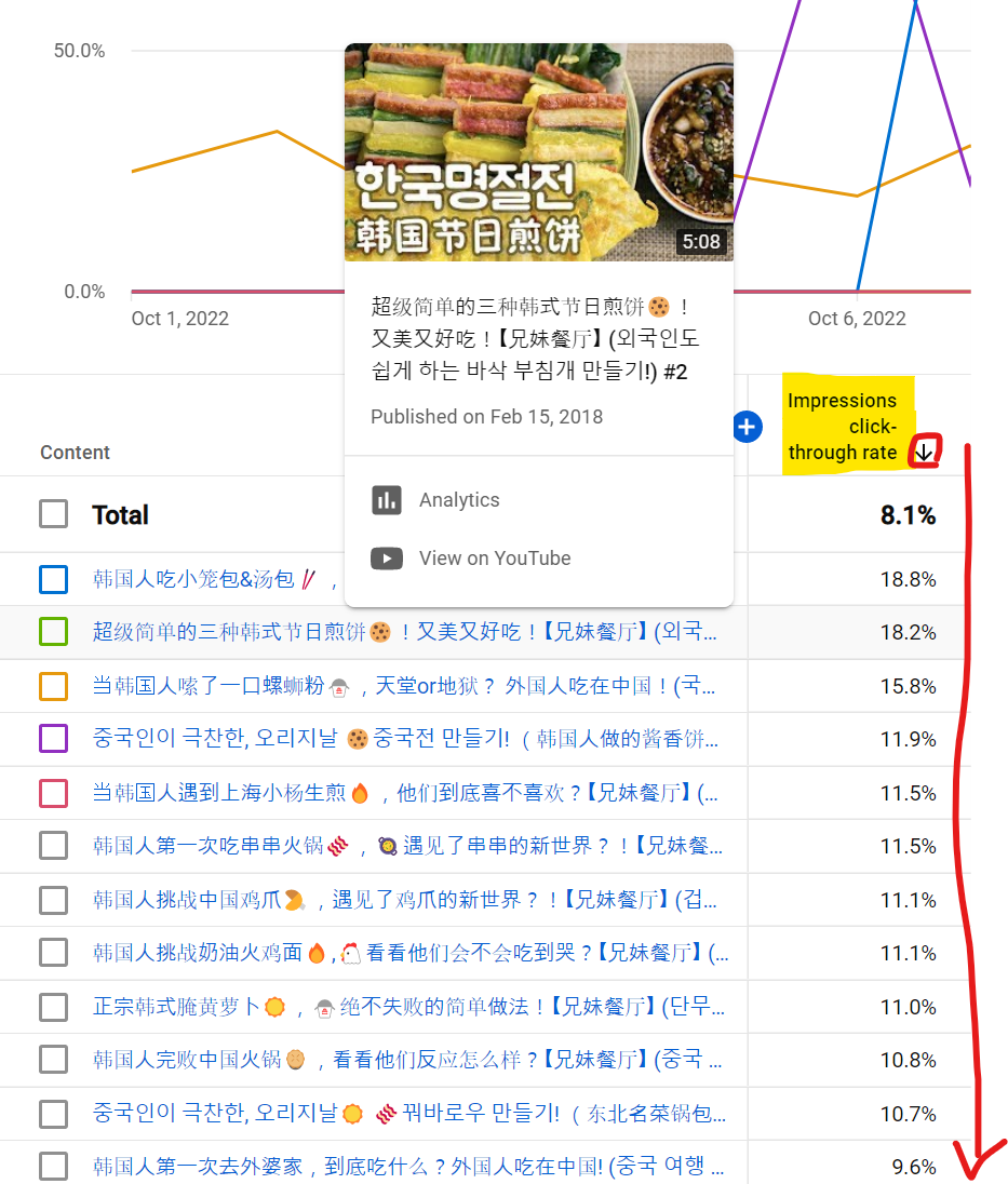 그리고 핸드폰으로 봤을 때 썸네일이 눈에 잘 들어온다면, 이제 유튜브 스튜디오의 ‘노출 클릭률(Impressions click-through rate)’을 보세요. ‘노출 클릭률’이란 말 그대로, 노출 수 대비 사람들이 얼마나 클릭했는지를 나타내줍니다. 즉, 이것은 썸네일을 잘 만들었는지, 못 만들었는지 확인할 수 있는 지표입니다. 대부분 썸네일을 보고 들어오니까요. 그래서 3개월 기준 정도로, 노출 클릭률을 클릭해서 내림차순 합니다. 그렇게 하면 어떤 썸네일이 시청자들에게 반응이 좋았는지를 알 수 있습니다.