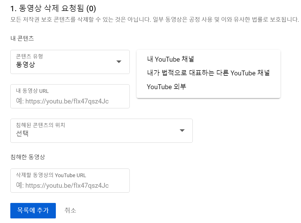 여기에 들어가셔서 첫 번째로는 본인 영상을 입력하시고, 두 번째로는 도용한 놈들의 영상 링크를 입력하세요. 여기서 주의할 점은 ‘목록에 추가’를 해서 한 번에 신고하시면 안 된다는 점입니다. 저작권 위반 경고가 3개 누적되면 채널이 삭제되는데요. 목록에 추가해서 3개를 한꺼번에 신고하면, 저작권 위반 경고는 1개를 받더라고요. 귀찮으시겠지만 반드시 도용 영상 건별로 저작권 삭제 요청서를 제출하셔야 합니다.