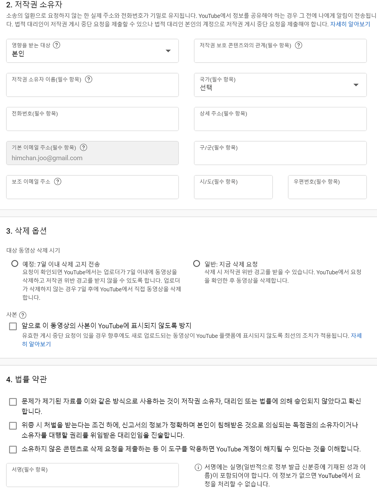 2. 저작권 삭제 요청서 제출 링크 : https://support.google.com/youtube/answer/2807622?hl=ko