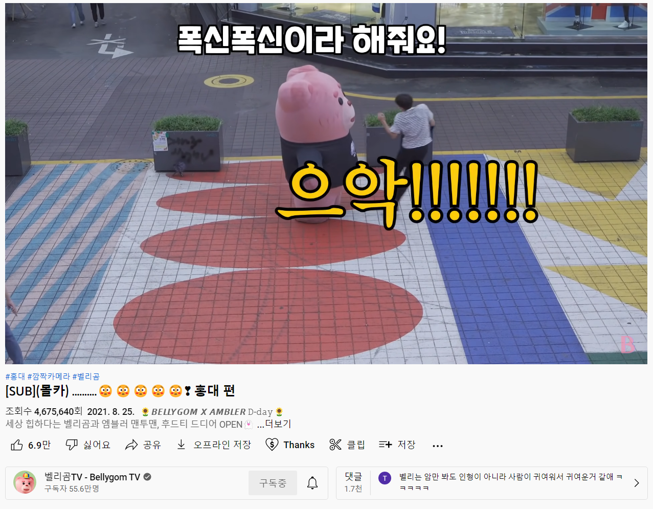 벨리곰 채널에서 가장 조회수가 많이 터지고, 공감 갔던 콘텐츠는 ‘인형탈 놀래키기(467만view)’ 콘텐츠입니다. 누구나 한 번쯤 인형탈을 보며, 당하거나 생각해본 일들이죠.