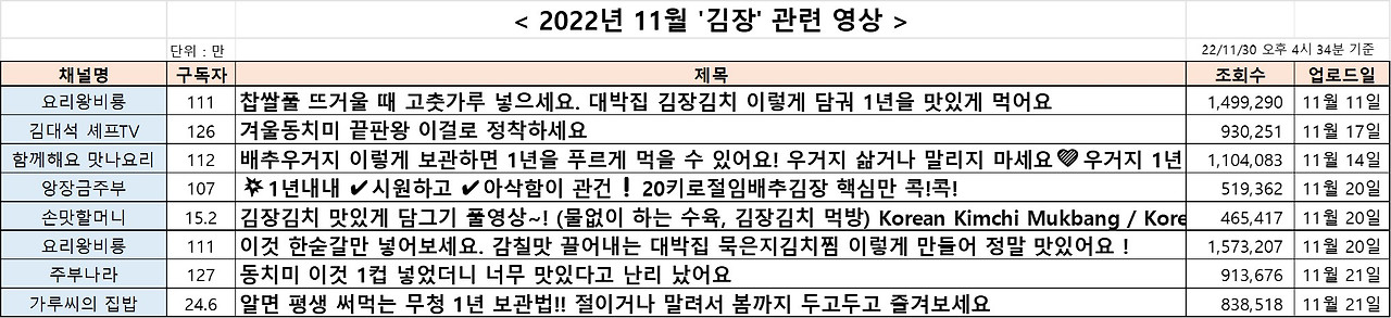 성장이 막힌 느낌이 드신다면, 인기 급상승과 현재 이 시점에는 '사람들이 뭘 하지?'를 생각해보세요. 그럼 채널의 확장에 큰 도움이 되는 콘텐츠를 기획하실 수 있을 겁니다. 11월 김장 때문에 집에서 소환되시기 전에요.
