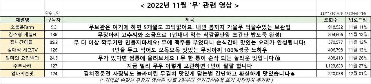 요즘은 김장철입니다. 이에 약 3~4주 전쯤부터 김치 관련 영상들이 지속적으로 인기 급상승에 떴습니다. 이 채널은 대부분 나이가 든 여성, 즉 주부 타겟들 채널들입니다. 11월 김장철에 딱 맞는 콘텐츠죠. 그리고 위의 채널 중, '동치미'와 '무청' 영상이 있죠. 이러한 무는 10월 ~ 12월 제철 음식입니다. 그렇기 때문에 최근에 무 관련 영상이 터지고 있죠. 11월 30일 자 인기 급상승에 2개나 있습니다.