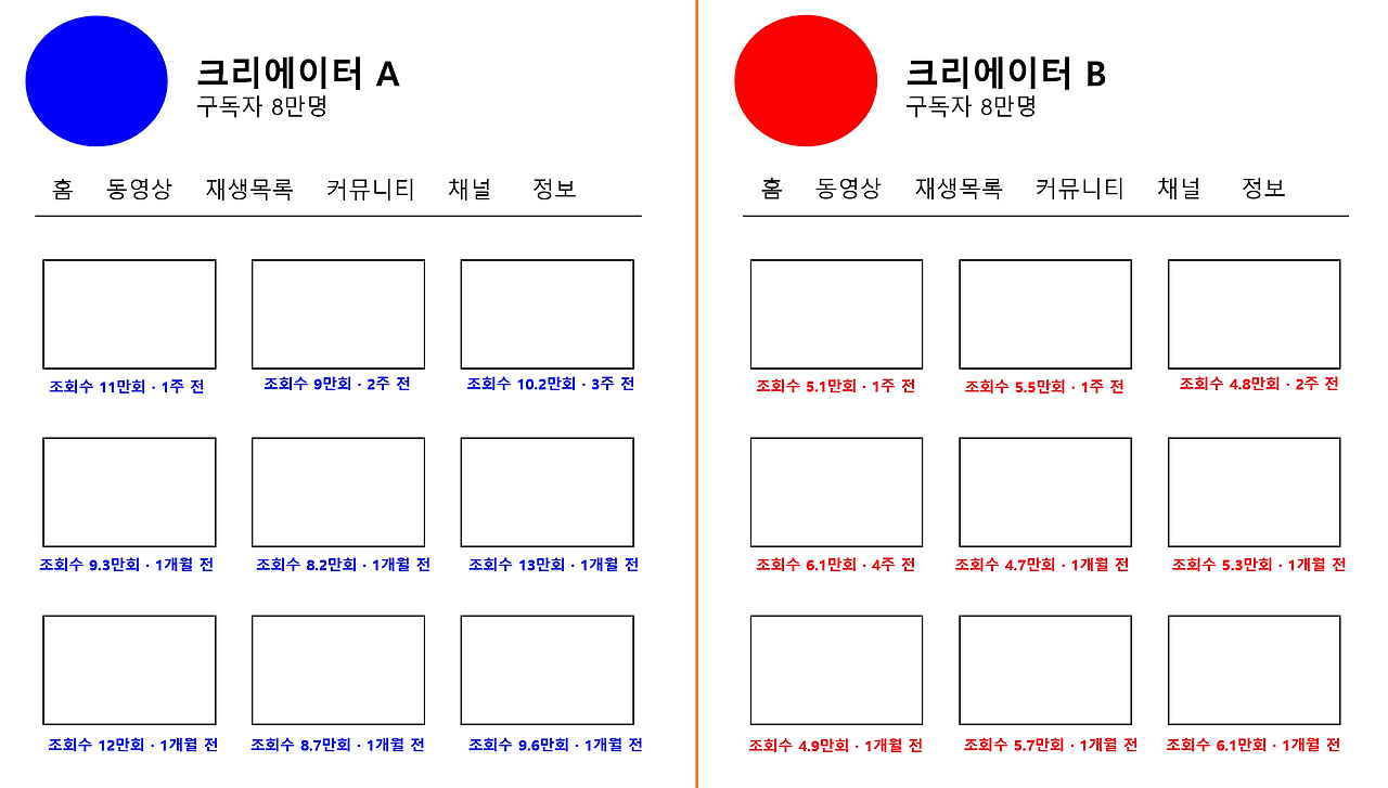 채널의 생동성이 덜 한 것이죠. 채널의 생명력엔 업로드 주기도 중요하지만, 평균 조회수 자체도 중요합니다. 똑같은 구독자라고 가정했을 때, A 채널은 평균 조회 수가 10만, B 채널은 평균 조회 수가 5만이라면 알고리즘은 A 채널을 더 추천해 줍니다. 그리고 전 이렇게 표현합니다.