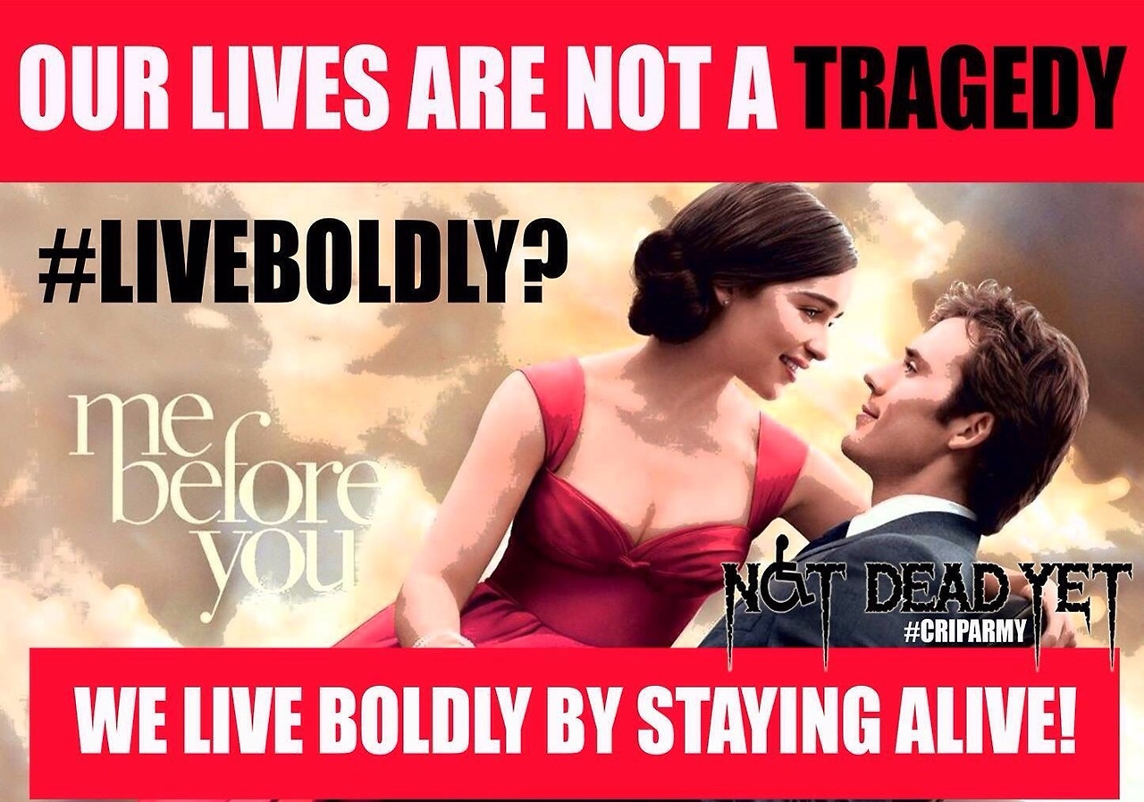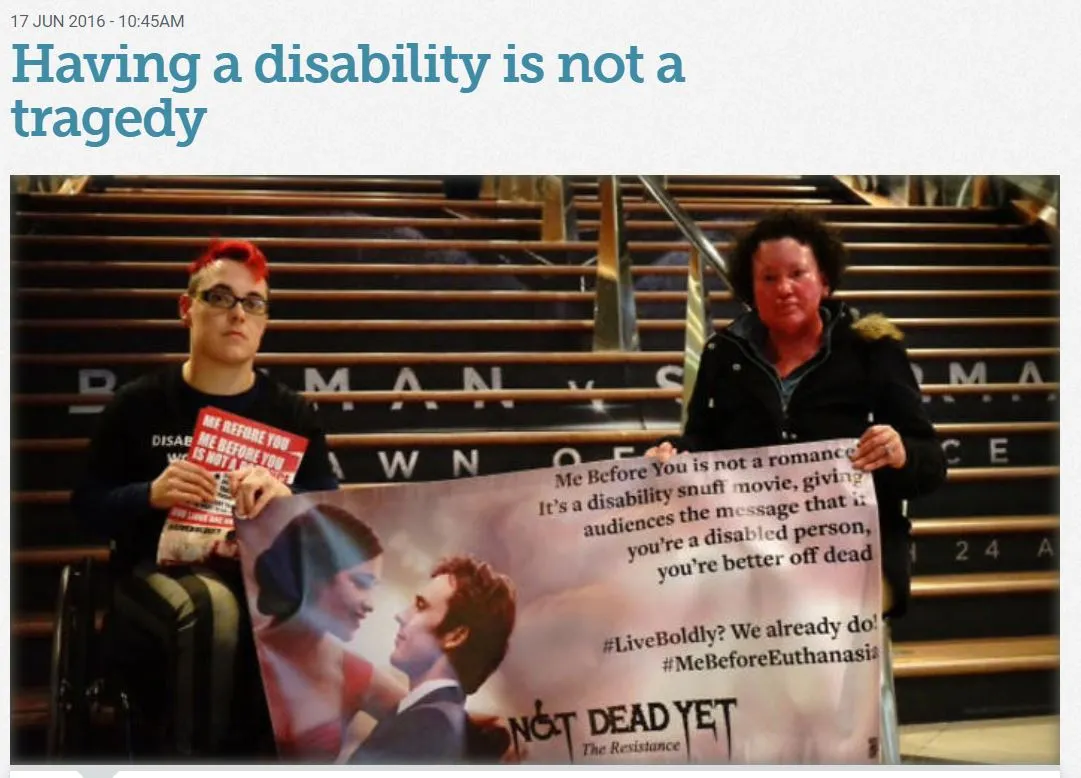 <미 비포 유>가 Ableism의 표본이자 말도 안 되게 잔인한 이유는, "모든 것을 다 갖춘" 주인공이 안락사를 선택하는 유일한 이유가 "신체적 장애"라는 점 때문이다. 이는 당신이 아무리 이 사회에서 요구하는 모든 성공의 요건을 갖춘 사람이어도 장애를 갖고 있다면 삶의 이유를 찾을 수 없다는 논리를 함축하고 있다.