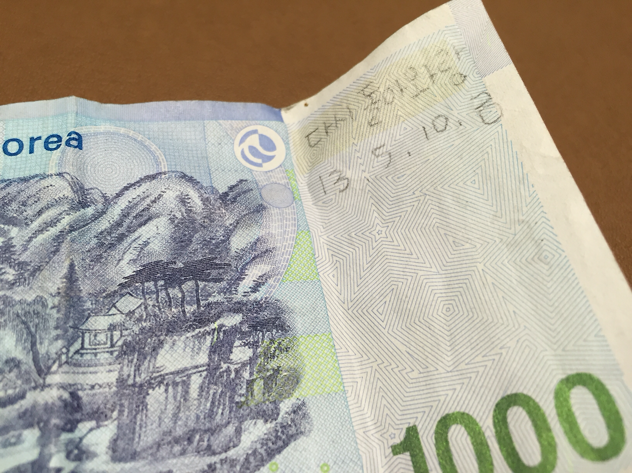 오늘은 이 천 원짜리 지폐를 떠나보낼 생각이다. (지폐에 낙서를 해서는 곤란하지만..) 글씨 주인에게 다시 한 번 스쳤으면 하는 사심을 담아, 희미해진 글자들 위로, 글씨체를 최대한 살려 선을 덧칠했다.