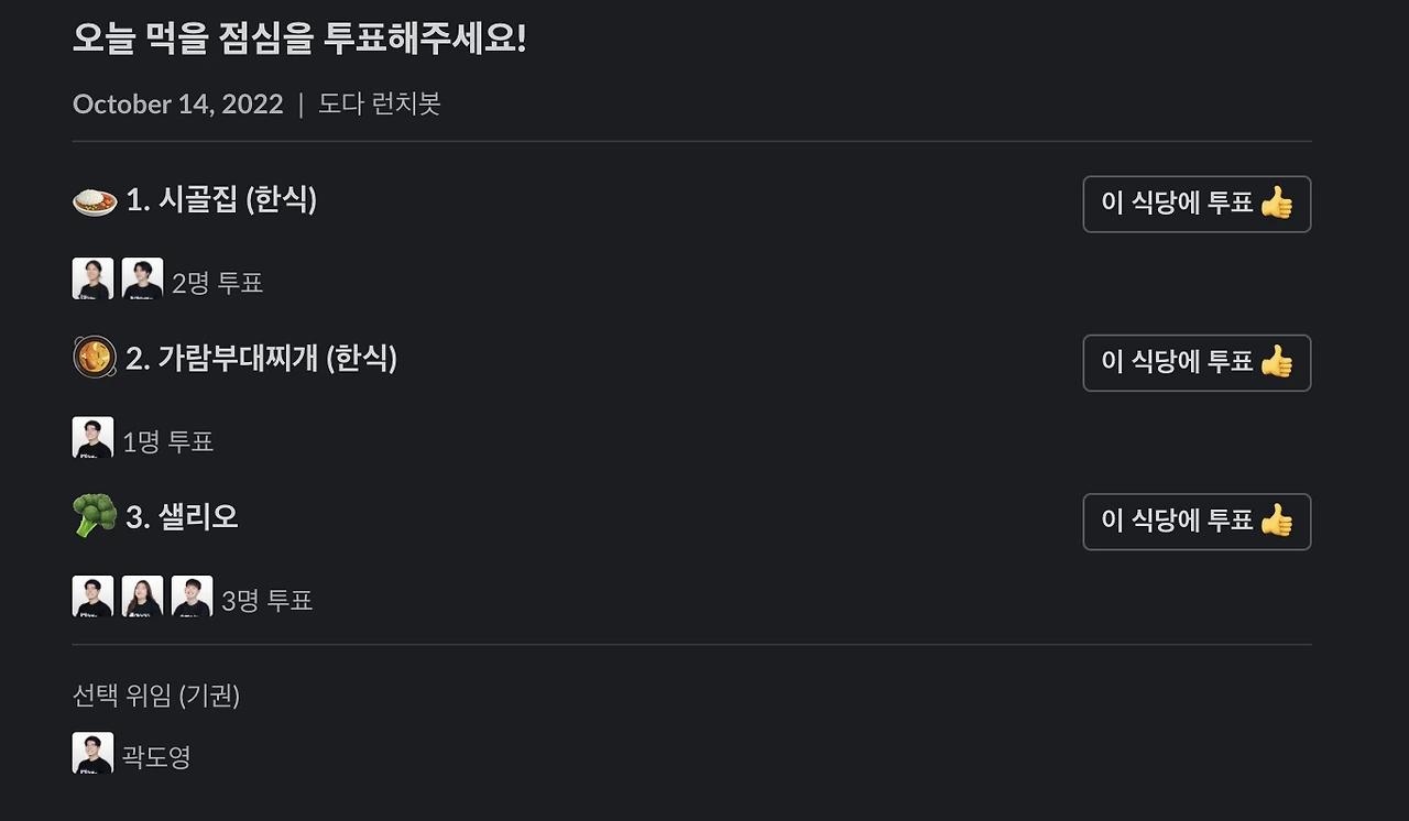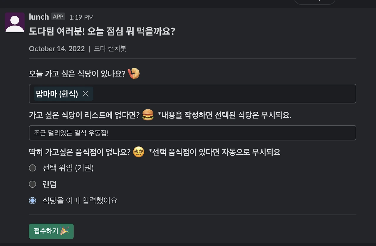 토이프로젝트(개인 프로젝트)로 도다 런치 슬랙 api를 만들고 있습니다. 완성된다면 이제 도다는 점심 메뉴 선택 장애로부터 해방입니다.