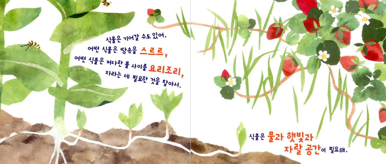 "식물이 자라는 데는 물과 햇빛과 자랄 공간이 필요하대! 음~ 우리도 식물처럼 자라는데 꼭 필요한 게 있지 않을까? 어떤 게 있을까?"
