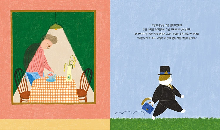 세 번째는 태도이다. 다정한 할머니와 여유를 다 가졌어도 할아버지의 일관되게 성실하고 편견 없는 태도가 없었다면 이야기는 해피엔딩이 될 수 없다. 이야기 속 '고양이'는 단순히 입맛 까다로운 귀여운 인물이 아니다. 우리 삶에 두더지 게임처럼 등장하는 빌런이나, 진상이나, 잡상인이나, 고난이나, 행운의 다른 이름이다. 할아버지는 나와 다른 '고양이'를 편견 없이 대했다. 할아버지의 텅 빈 가게를 찾아온 딱 한 명의 고객이 하필 까다롭다. 내가 자랑하는 '차'를 거들떠보지도 않는 고양이를 만족시키기 위해 할아버지는 자신을 갈고닦는다.