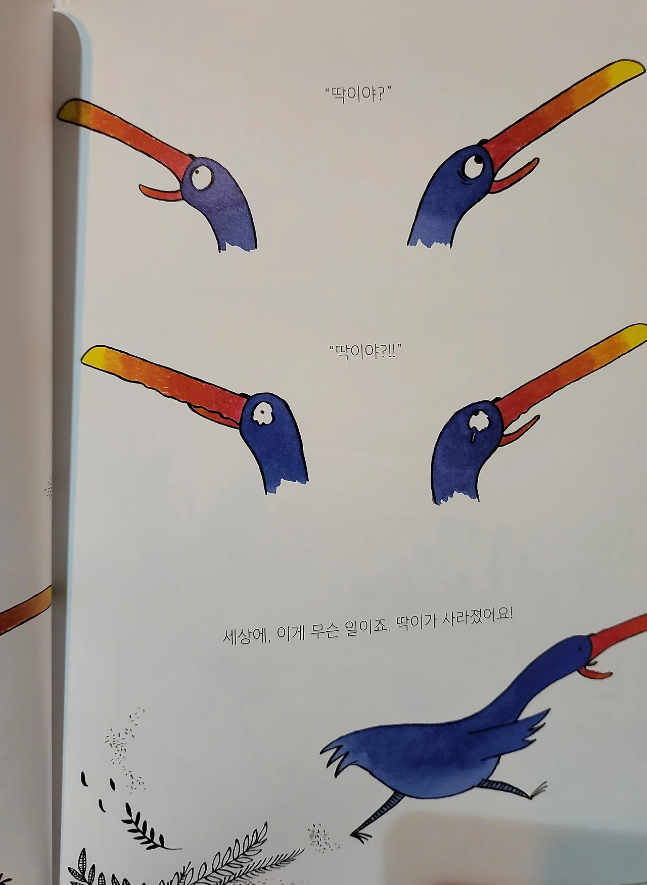 두 마리의 새가 세상에 둘도 없는 단짝이라는 것은 쉽게 예상할 수 있다. 갈등은 '딱'이가 어느 날 갑자기 말없이 사라지면서 발생한다. 하루종일, 매일매일 붙어 다니던 단짝이 갑자기 내 시야에서 완벽히 사라지면 나는 어떤 생각이 제일 먼저 들까?