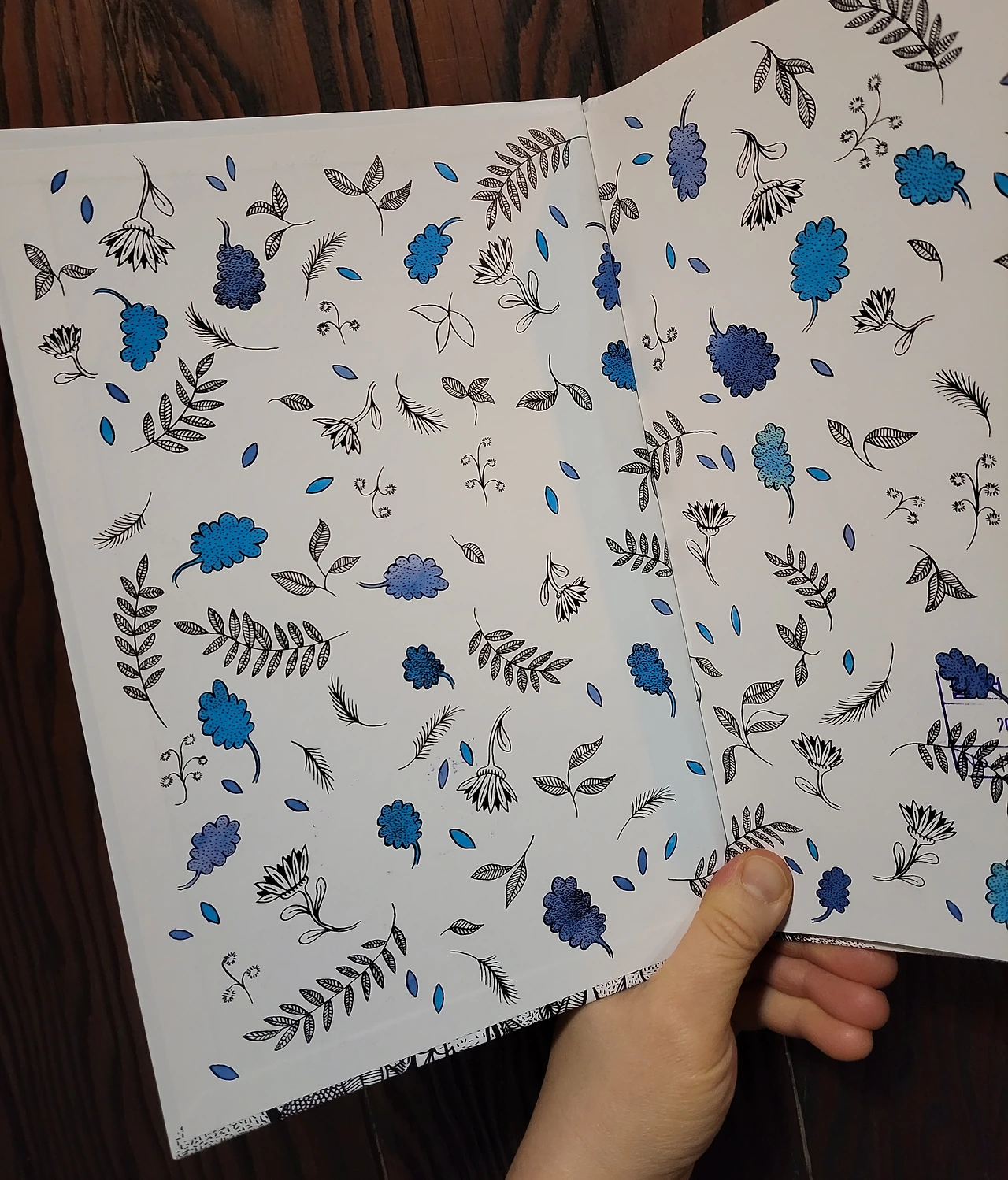 면지 가득 파랑과 검은색으로 대비되는 식물들이 풍성하게 채워져 있다. 같음과 다름의 어울림. 두 마리 새의 조화로운 노랫소리가 면지에 숨겨져 있는 듯 경쾌하다.