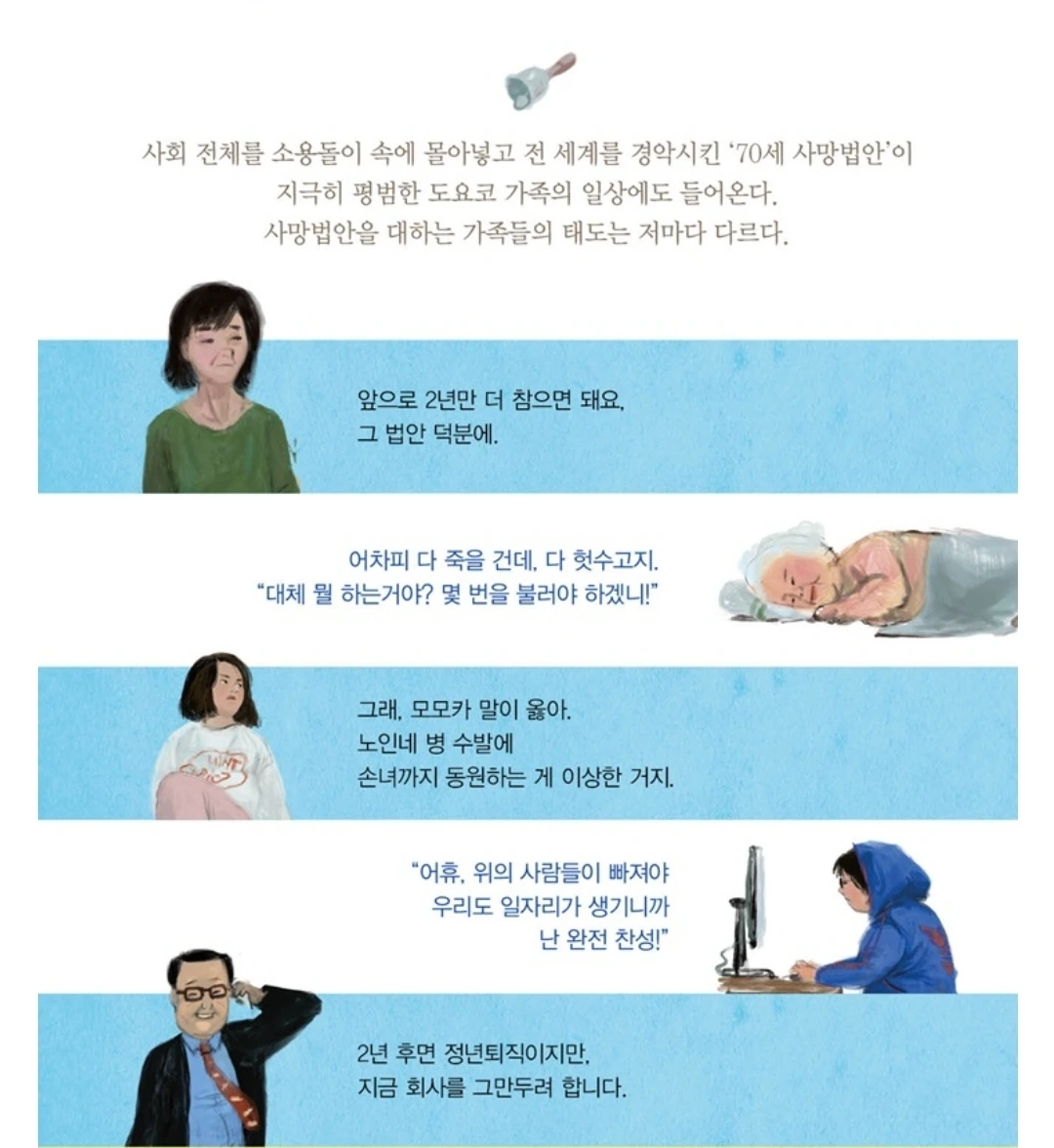 2년 뒤 법안의 시행을 앞두고 인권침해의 논란이 빗발쳤다. 늙은 시노모의 병시중을 하며 70세가 되기 전 남은 15년의 삶을 셈하는 한 며느리와 그 가족의 속내가 소설의 중심이다. 먼 미래의 이야기가 아니었고, 분명 남의 문제가 아닌 이 소설을 읽으며 자연스레 나와 부모님의 죽음에 대해 깊이 고민하게 되었다.
