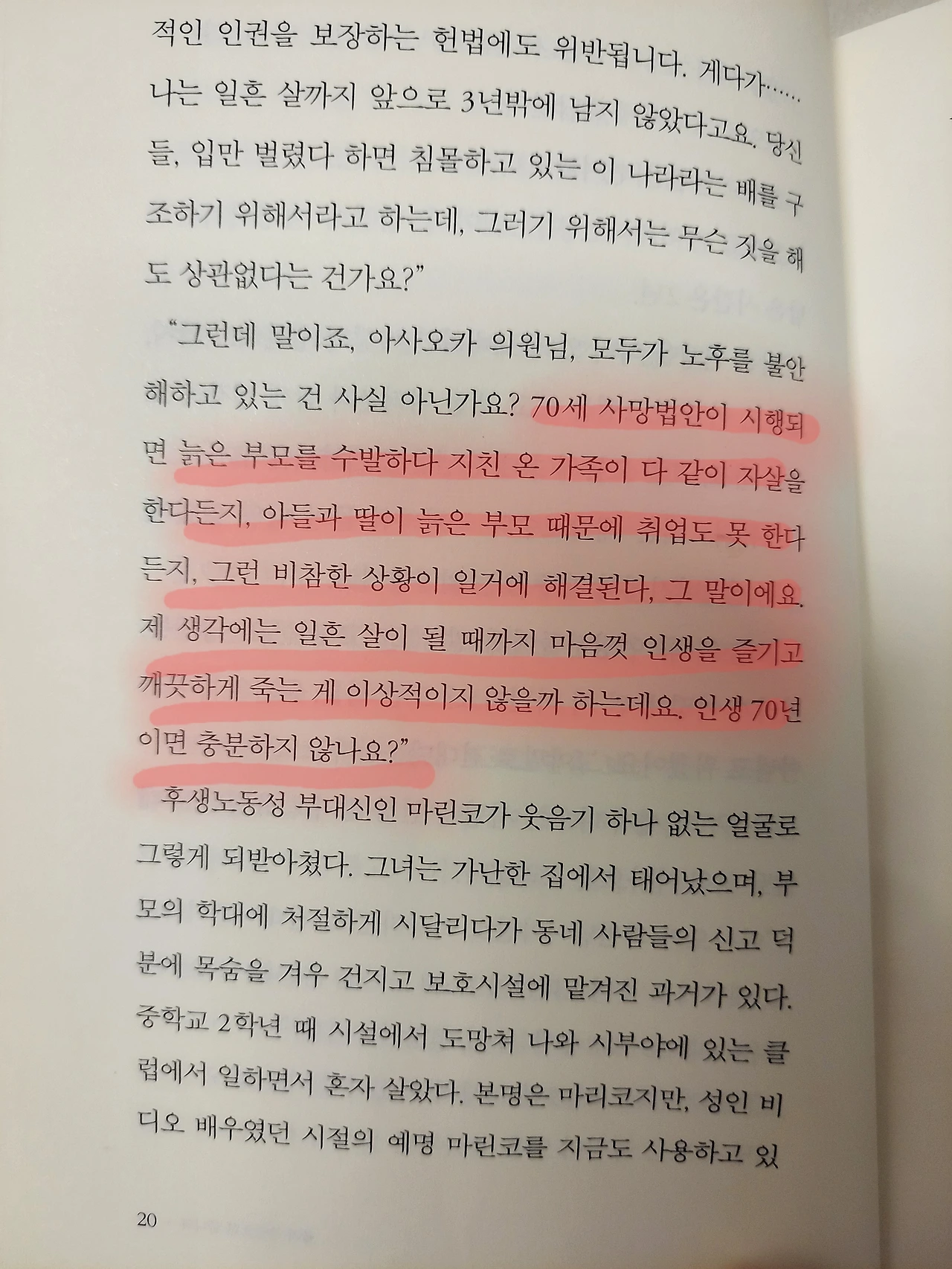 아직 더 살고 싶은데 기한이 다 되었으니, 젊은 세대에게 부담 주지 말고 그만 죽으라는 것은 잔혹한 말이다. 그렇다고 스스로 몸을 가눌 수 없는 노부모를 돌보느라 가족의 젊음이 속방 당하고 강요당하는 꼴을 지켜보는 것 역시 잔인한 일이다. 그래서 생을 마감하고 싶다고 마음먹은들... 안락사 역시 법의 테두리에서 맴돌며 사회적 합의를 끌어내지 못하고 있는 사회. 나는 이런 사회에서 준비 없는 죽음을 맞이하고 싶지 않았다. 터무니없는 죽음의 과정을 가족에게 던져주고 싶지 않았다.