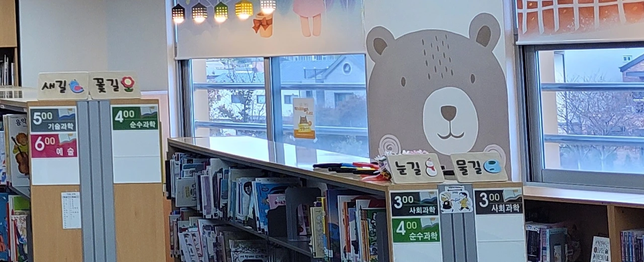 방과 후 수업이 끝나면 도서관 구석에서 책을 읽다가 나와 함께 퇴근하는 아이들이 몇 명 있다. 나의 꼬마 퇴근 동료들은 요즘 서가위에 올려놓은 꽃 화관을 머리에 얹고 놀다가는, '해길 ' 서가로 가서 인기 도서를 골라 온다. 책 모양 쿠션을 베개 삼아 온돌마루 카펫 아래 다리를 밀어 넣고 줄줄이 드러누워 책을 들척인다. 그마저 시들해지면 머리맡 계단 서가에 꽂힌 그림책을 뽑아 슬슬 훑다가 자기들끼리 속살거린다.