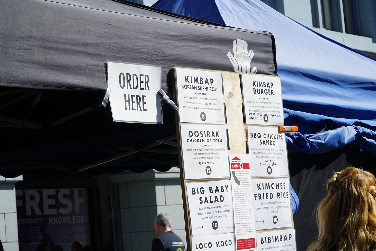입구를 찾아서 걸어가던 중에 익숙함이 느껴져서 한쪽을 쳐다봤다. 한 가게의 메뉴판에서 김밥, 김밥 버거, 김치볶음밥, 비빔밥이 보인다. K-Pop에 이어서 K-Food도 인기라는 것이 실감된다.