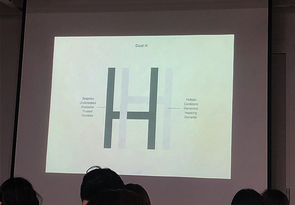 이 로고와 현대백화점에 '기존의 현대와 새로운 현대가 같이 공존하는' , '백화점과 고객 사이' , '전통과 현대 사이' 등 두 개의 현대를 'Dual H'라는 브랜드 아이덴티티를 부여하여 표현하였다고 한다.
