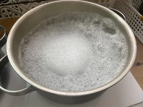 집에 있는 가장 큰 냄비에 물을 넣고 끓인 후 과탄산소다 2~3 스푼을 넣어준다. 거품이 넘칠 수 있으니 물은 냄비의 절반 정도만 채워 넣어 끓여야 한다. 위 사진의 냄비는 우리 집에서 가장 큰 냄비인데 주로 삼계탕을 끓일 때 쓰는 냄비이다. 압력솥과 크기가 비슷해서 압력솥이 다 잠기지는 않지만 그래도 세척하는 데는 문제없다.